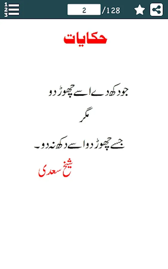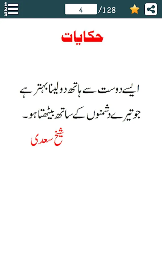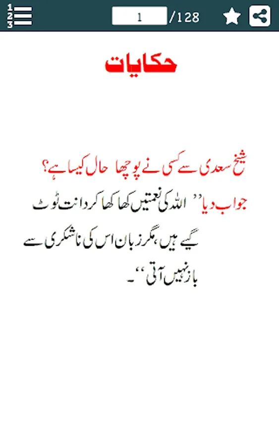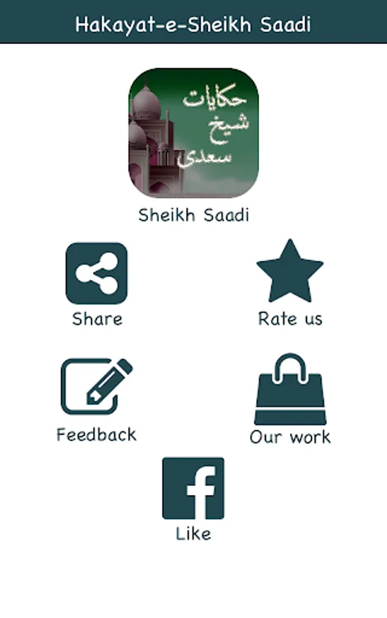 Hikayat-e-Sheikh Saadi application content is Sheikh Saadi Quotes in Urdu.