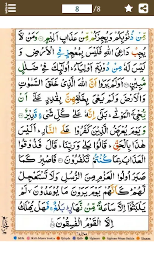 Al-Ahqaf (Arabic: اَلْأَحْقَافُ, "the sand dunes" or "the winding sand tracts") is the 46th chapter (surah) of the Qur'an with 35 verses (ayat). This is the seventh and last chapter starting with the letters ha-mim. Regarding the timing and contextual background of the supposed revelation (asbāb al-nuzūl), it is one of the late Meccan chapters (Makki Surah), except for verse 10 and possibly a few others which Muslims believe were revealed in Medina (Madinah / Madina).