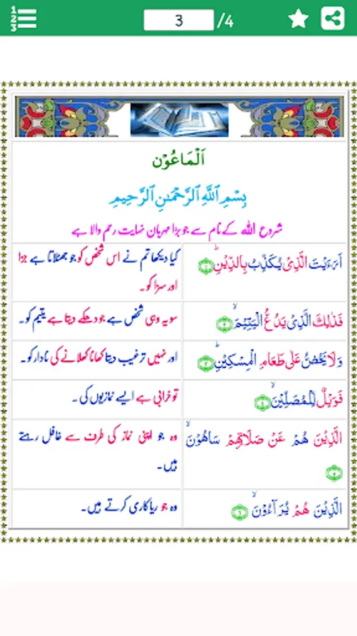 Surat al-Ma'un (Arabic: سورة الماعون, "Small Kindnesses, Almsgiving, Acts of Kindness, and Have You Seen") is the 107th sura of the Qur'an with 7 ayat. This sorat is positioned in Para 30 which is also known as Juz Amma (Juz' 30). Regarding the timing and contextual background of the supposed revelation (asbāb al-nuzūl), it is an earlier "Meccan / Makki surah", which means it is believed to have been revealed in Mecca (Makkah), instead of later in Madinah.