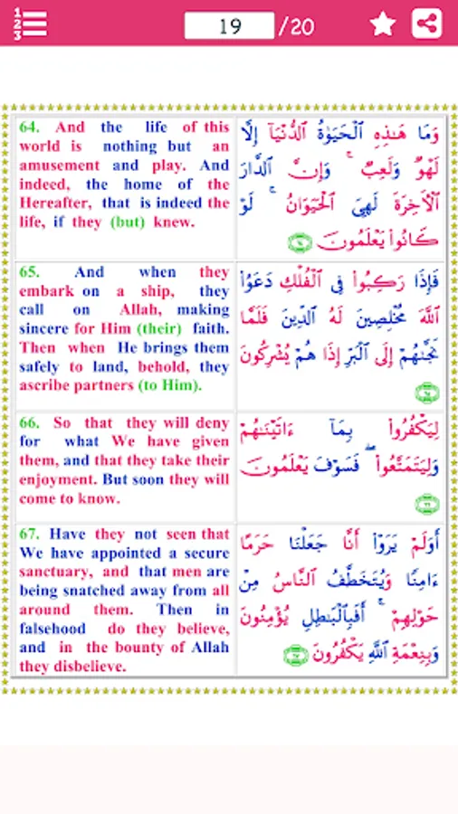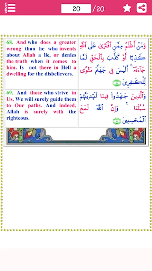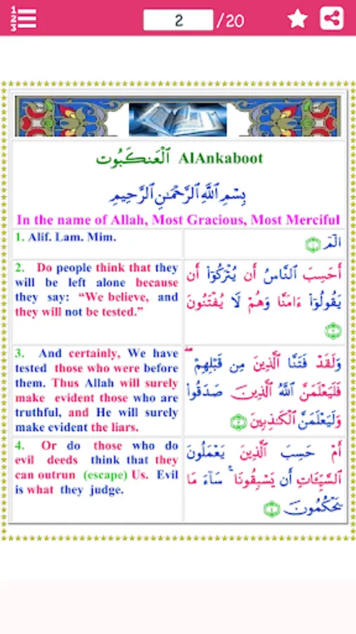 The first 11 ayaat of this Surah are ‘madani’ and the rest were revealed in Makkah. This Surah has a total of 69 verses. In the commentary of Burhan it is narrated from Imam Jafar as Sadiq (a.s.) that whoever recites Surah al-‘Ankabut on the 23rd night of the month of Ramadhan, will enter Jannah without any questioning.