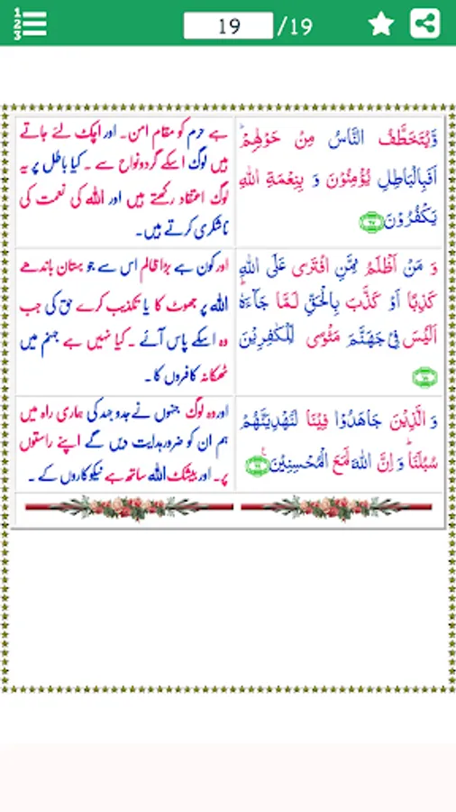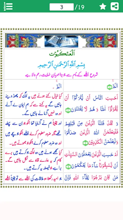 The first 11 ayaat of this Surah are ‘madani’ and the rest were revealed in Makkah. This Surah has a total of 69 verses. In the commentary of Burhan it is narrated from Imam Jafar as Sadiq (a.s.) that whoever recites Surah al-‘Ankabut on the 23rd night of the month of Ramadhan, will enter Jannah without any questioning.