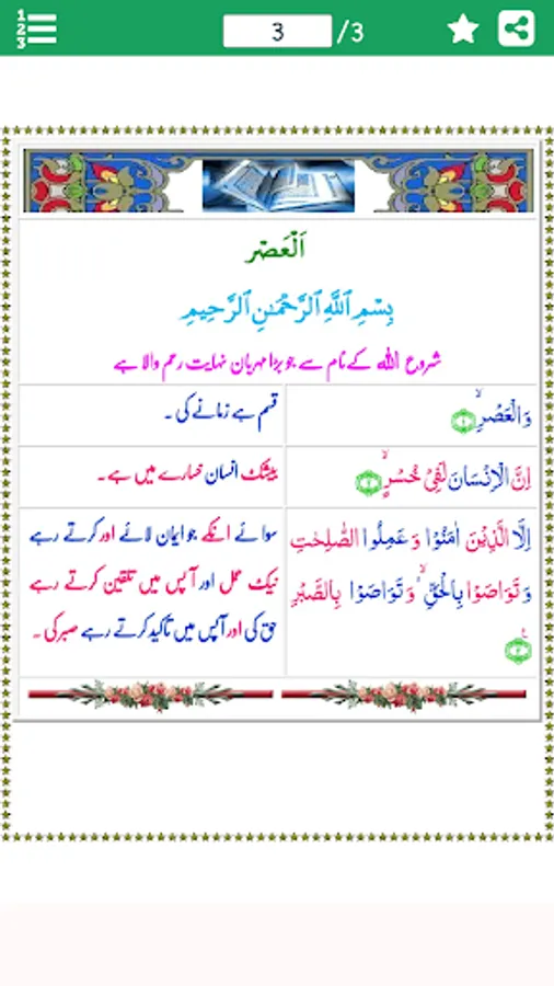 Al-Asr (Arabic: العصر, "The Declining Day, Eventide, The Epoch, Time") is the 103rd chapter (surah) of the Qur’ān, the Muslim holy book. This sorat is positioned in Para 30 which is also known as Juz Amma (Juz' 30). It contains three verses (āyāt). Surat al-‘Asr is the second shortest chapter after al-Kawthar.