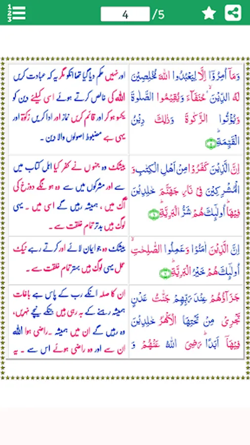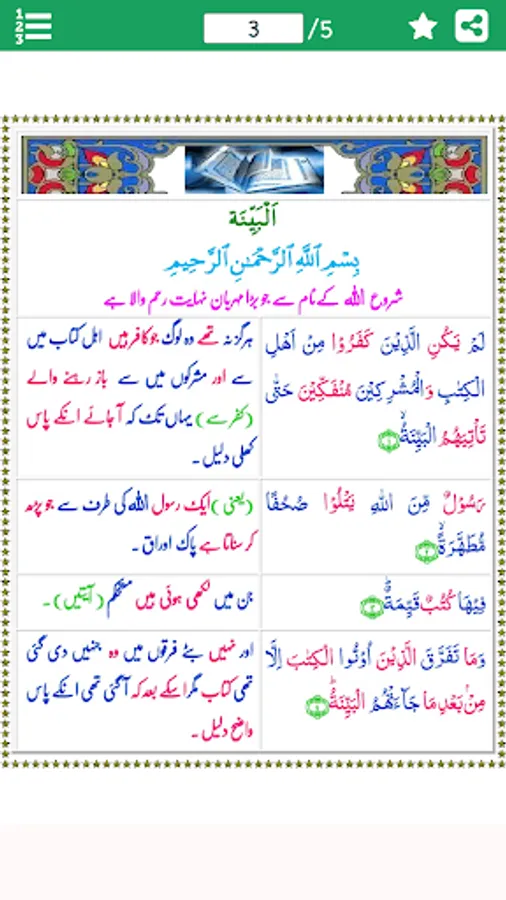 Al-Bayyinah (Arabic: البينة, "The Clear Proof, Evidence") is the 98th Chapter (surah) of the Qur'an with 8 verses (ayat). This sorat is positioned in Para 30 which is also known as Juz Amma (Juzz 30). The Surah is so designated after the word al-bayinah occurring at the end of the first verse.
