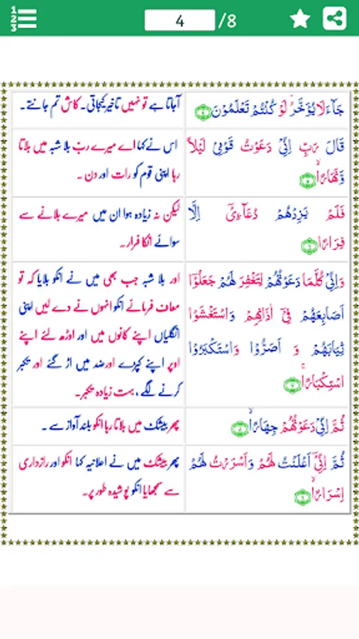 In Verses 5–20, Nuh informs Allah that his people are not accepting his message. Nuh tries to make clear to the people that all of the Earth, the sun, the moon are signs of Allah’s existence.