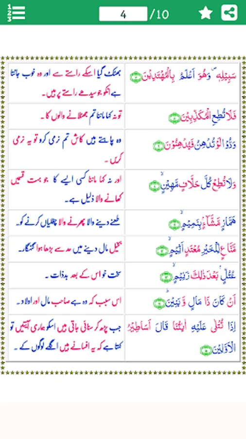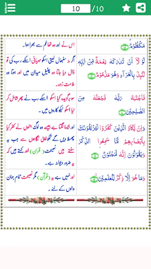 2. The Messenger of Allah (s.a.w.s.) said: Whoever recites Surah Qalam, Allah would give him reward like those persons whose good manners are likeable in His view.
