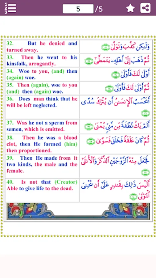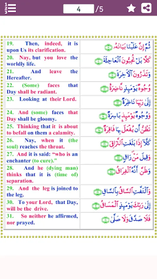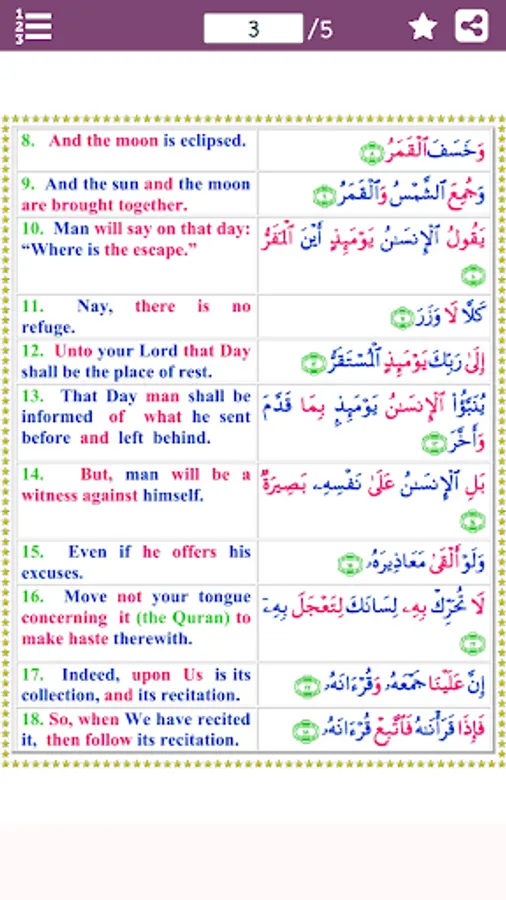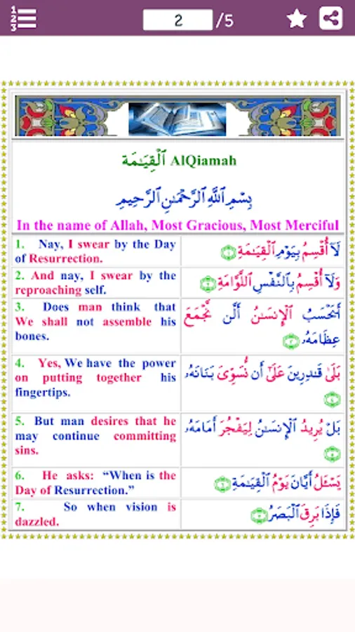 Baca Surat Al-Qiyamah lengkap dengan bacaan arab, latin, terjemah Indonesia dan terjemah Inggris. Apps cepat, ringan, hemat RAM & hemat kuota.