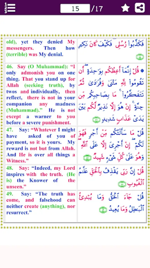 The Messenger of Allah (s.a.w.s.) said: For one who recites Surah (Sorah / Surat / Sorat / Sura) Saba there would none from the prophets and messengers who would not be his companion and shake his hand.