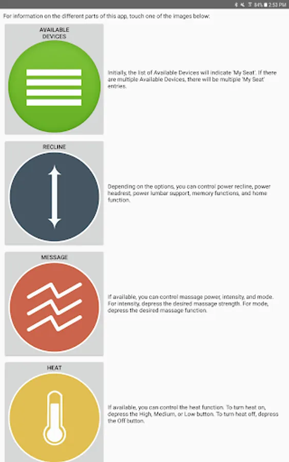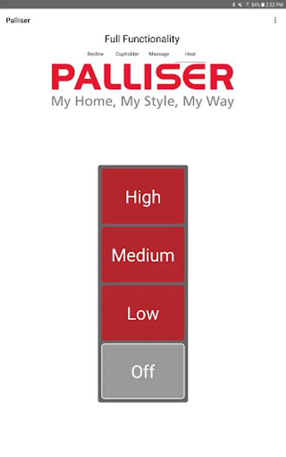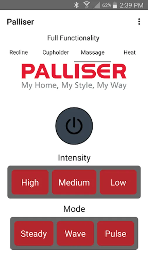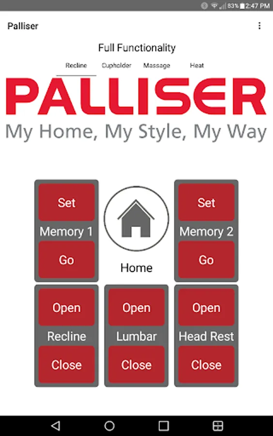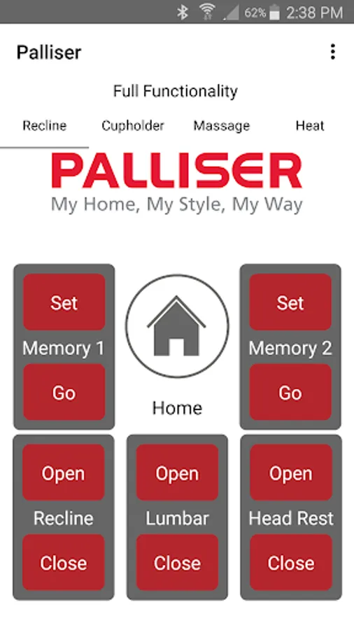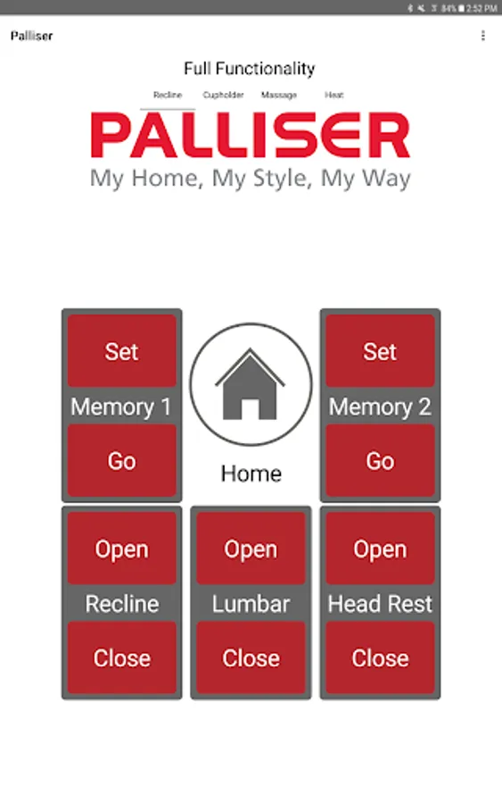 The app allows you to connect to your enabled furniture via Bluetooth from your phone or tablet. Depending on the options, you can control the electric motors that move your chair or sofa and may include power recline, power headrest, power lumbar support, memory functions, home function, light, cooling cup, heat, and massage.