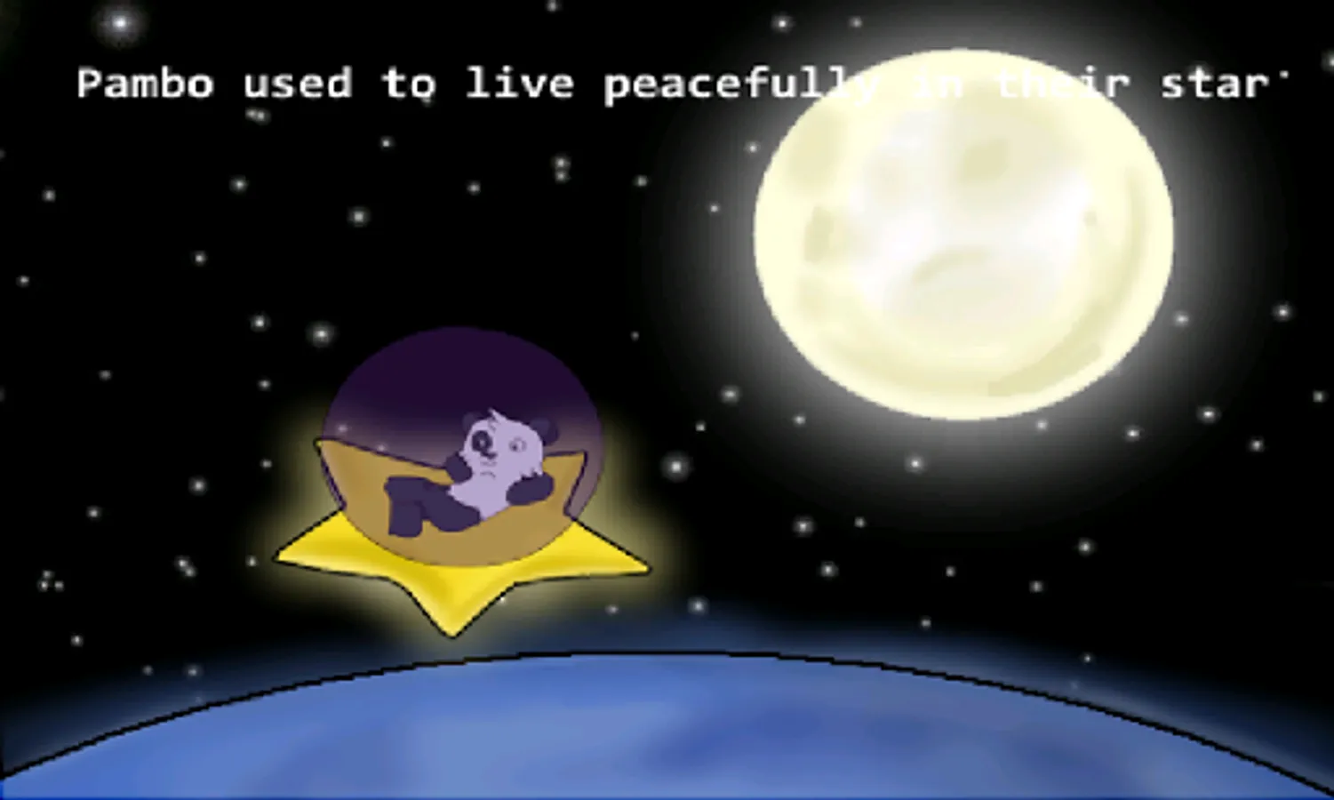 Pambo, a panda, lived happy in his star, protected by his bubble-ball. One day, however, a mysterious beam crashed into the star and made it blow into pieces. Slowly they fell along with Pambo on Earth. Now it is your time to help Pambo recover all the lost pieces of his star!