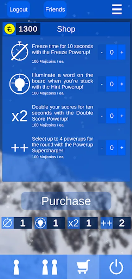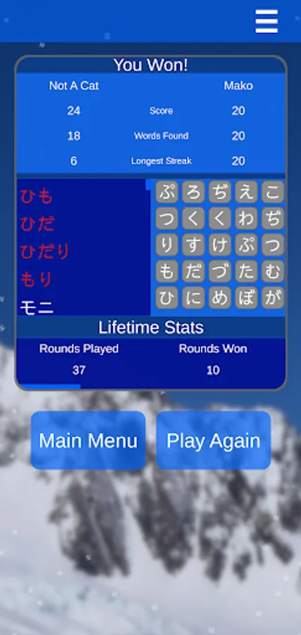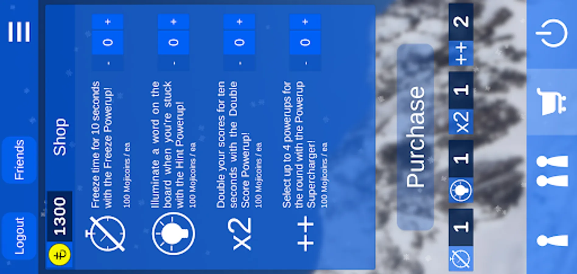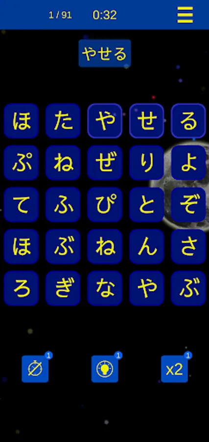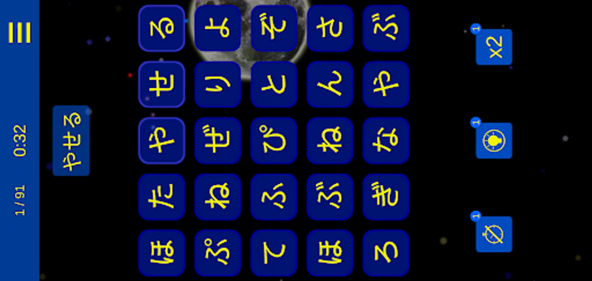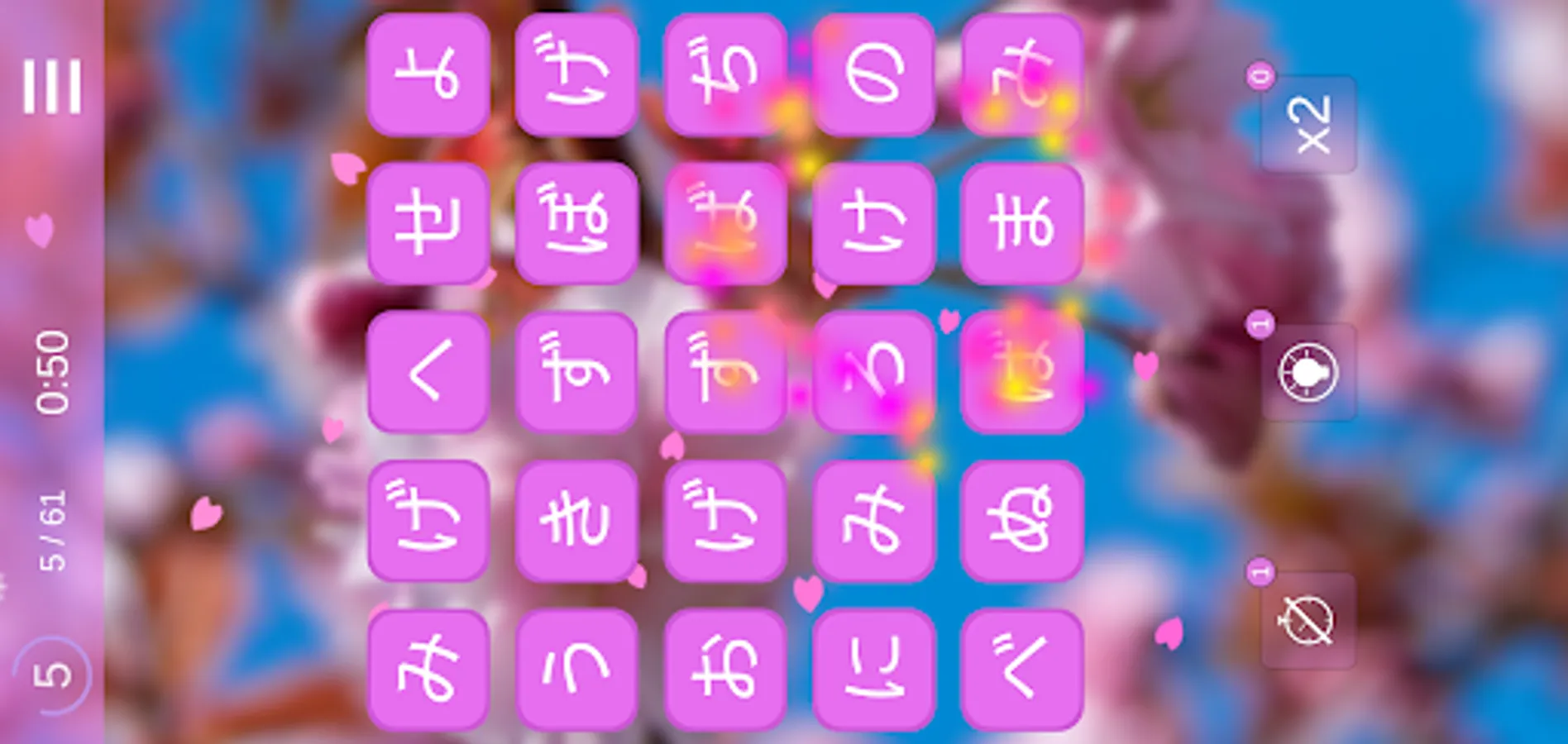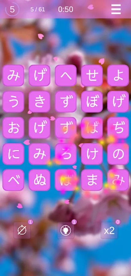 Challenge yourself to find as many Japanese words as you can in 60 seconds! Wield awesome powerups to pump up your score. Freeze pauses the timer for a few moments, Hint reveals a word for you, and the Double Score powerup gives you two times the points for each word found!