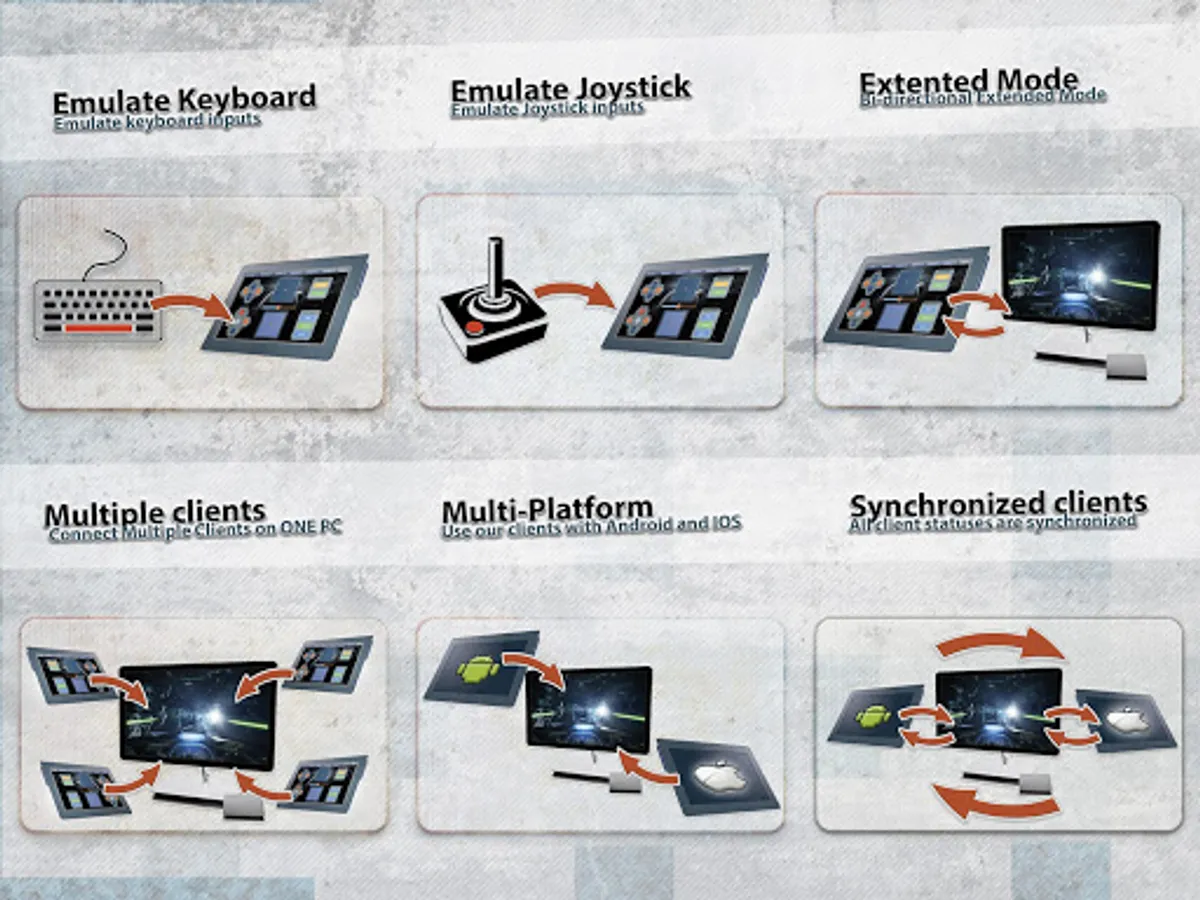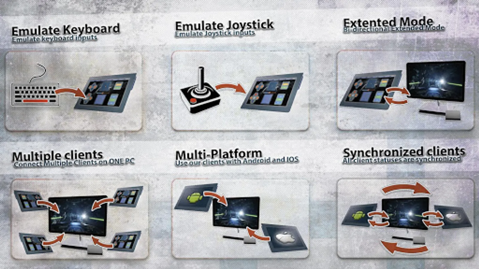 Load, Create and Switch between 6 customs UIs made by mixing gamepads, joysticks, mouse and keyboard to play with your favorites PC games on your tablet(acting like a remote). The UIs are made of 13 kinds of fully customizable prefabs like buttons, sliders, 2 axis sliders, accelerometers and more.
