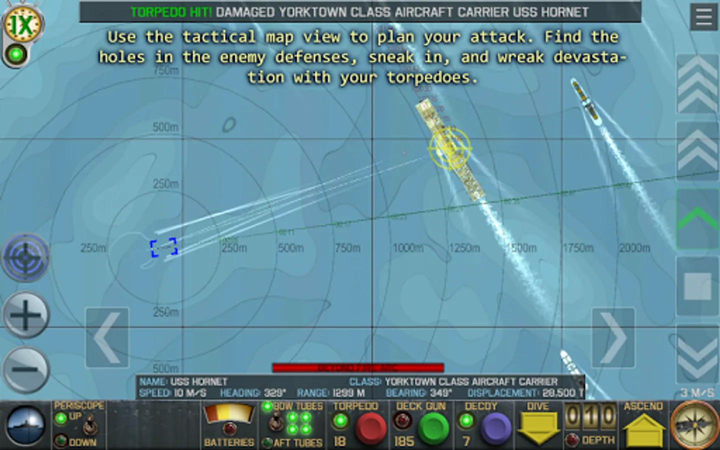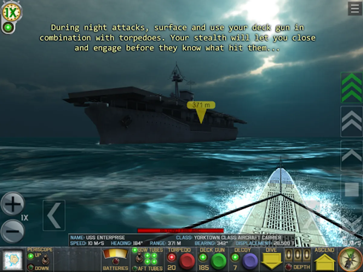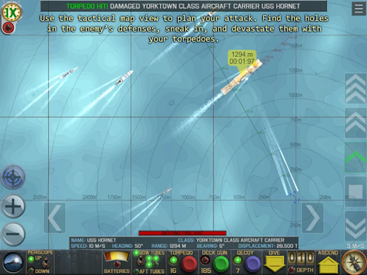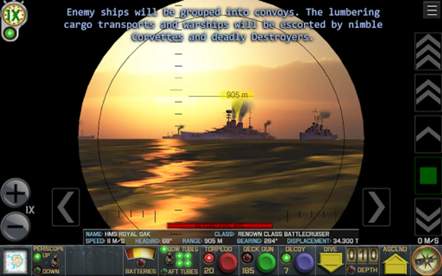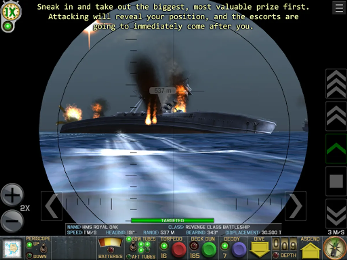 When the escorts come after you, drop decoys and sneak away before they can crush you with their depth charges.