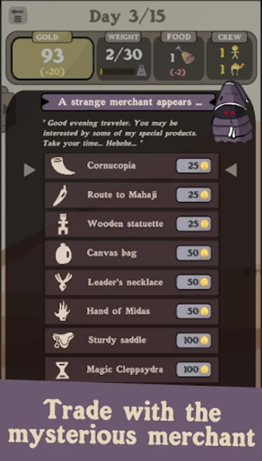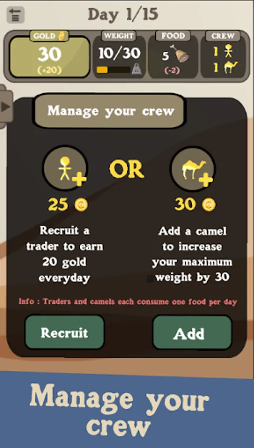 As a merchant, manage your caravan and your resources carefully to become the richest trader, and earn more money. Do trading, buy resources low, sell them high and make profit with other merchants. Upgrade your caravan, recruit traders to help you or add camels to carry more stuff. But donβt forget to feed them! Find the good balance and the best strategy to become the richest merchant.