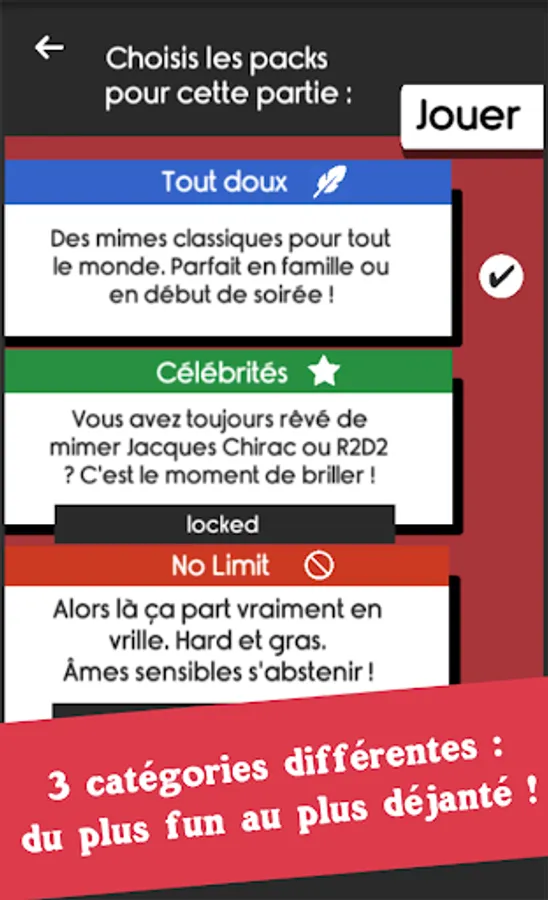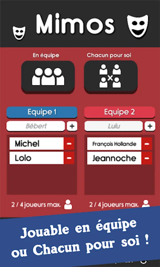 Mimos π Game of Mimes is the best game to play at night with friends. Three categories are available, with hundreds of French expressions and funny lines!