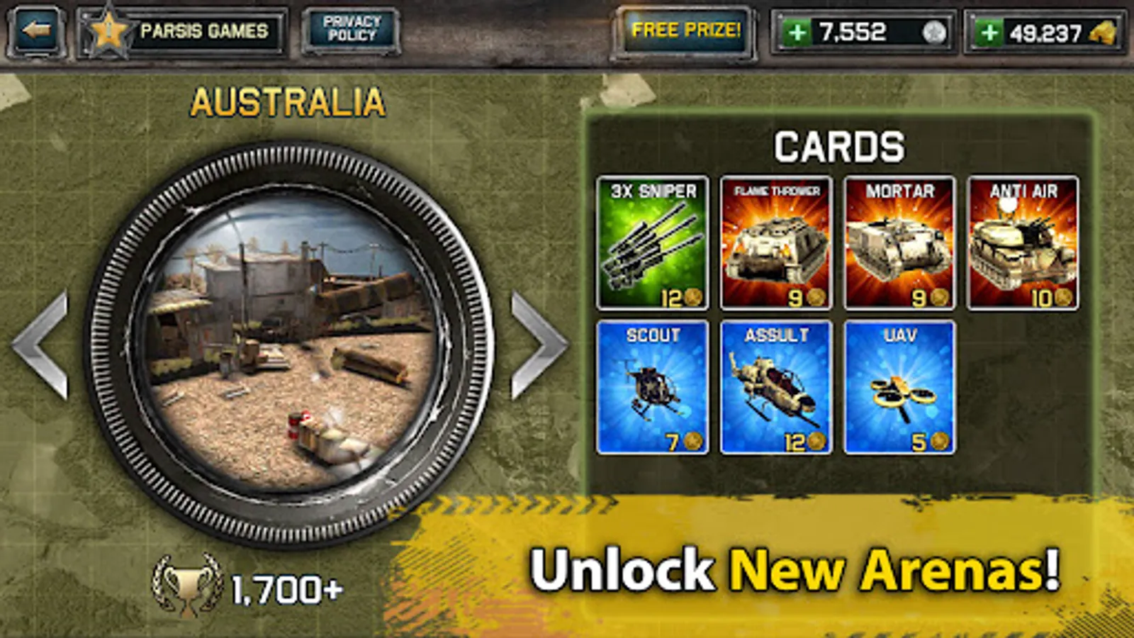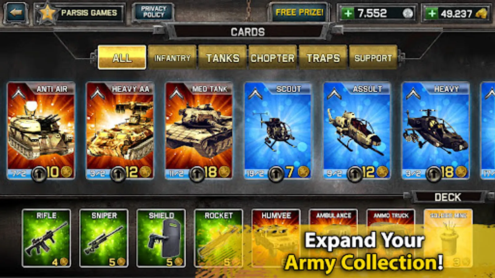 + More than 50 unique units and cards, including soldiers, commando, tanks, airplanes, bombs, mines, traps, rocket launchers, Anti-aircraft guns and more!