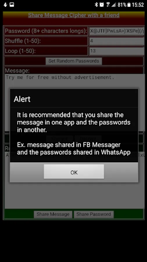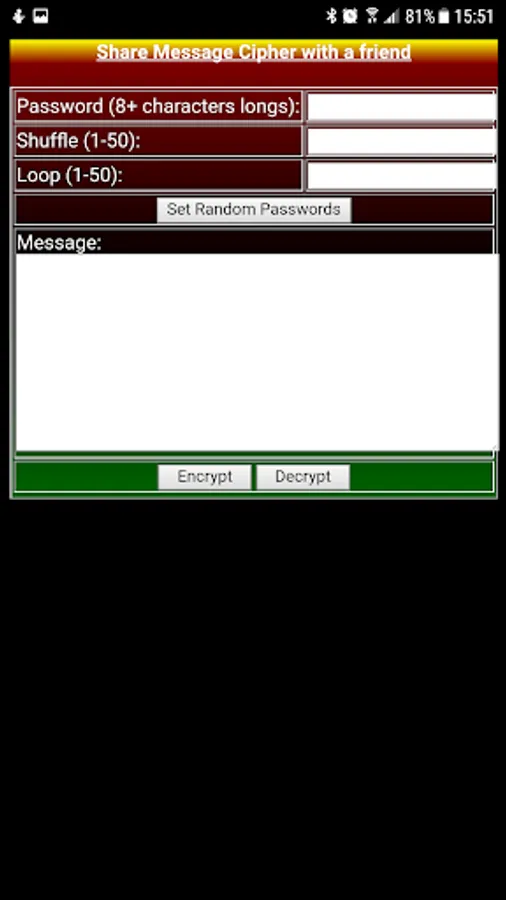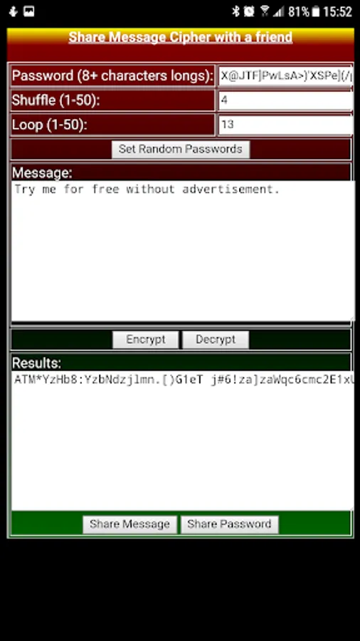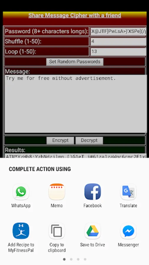 Looking for that added security? With Pat's Message Cipher you can encode your private messages and share them with today's most popular social media apps. Not only is your message encoded with a password, but it's also scrambled and looped to the user's specifications. It is impossible to decrypt messages without the password and encryption settings. Brute force attack proof!