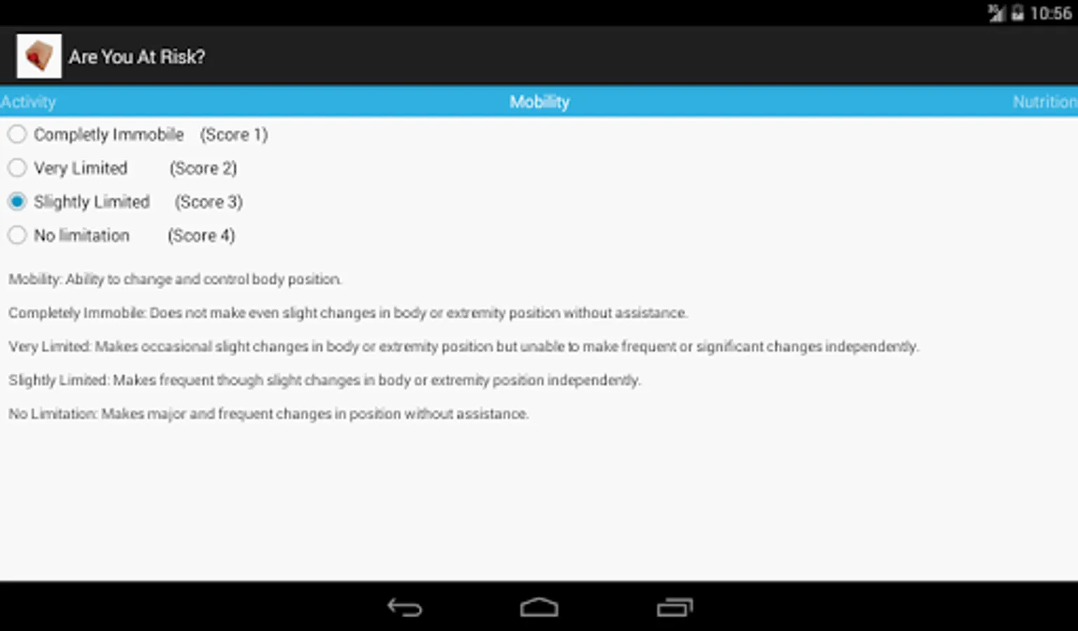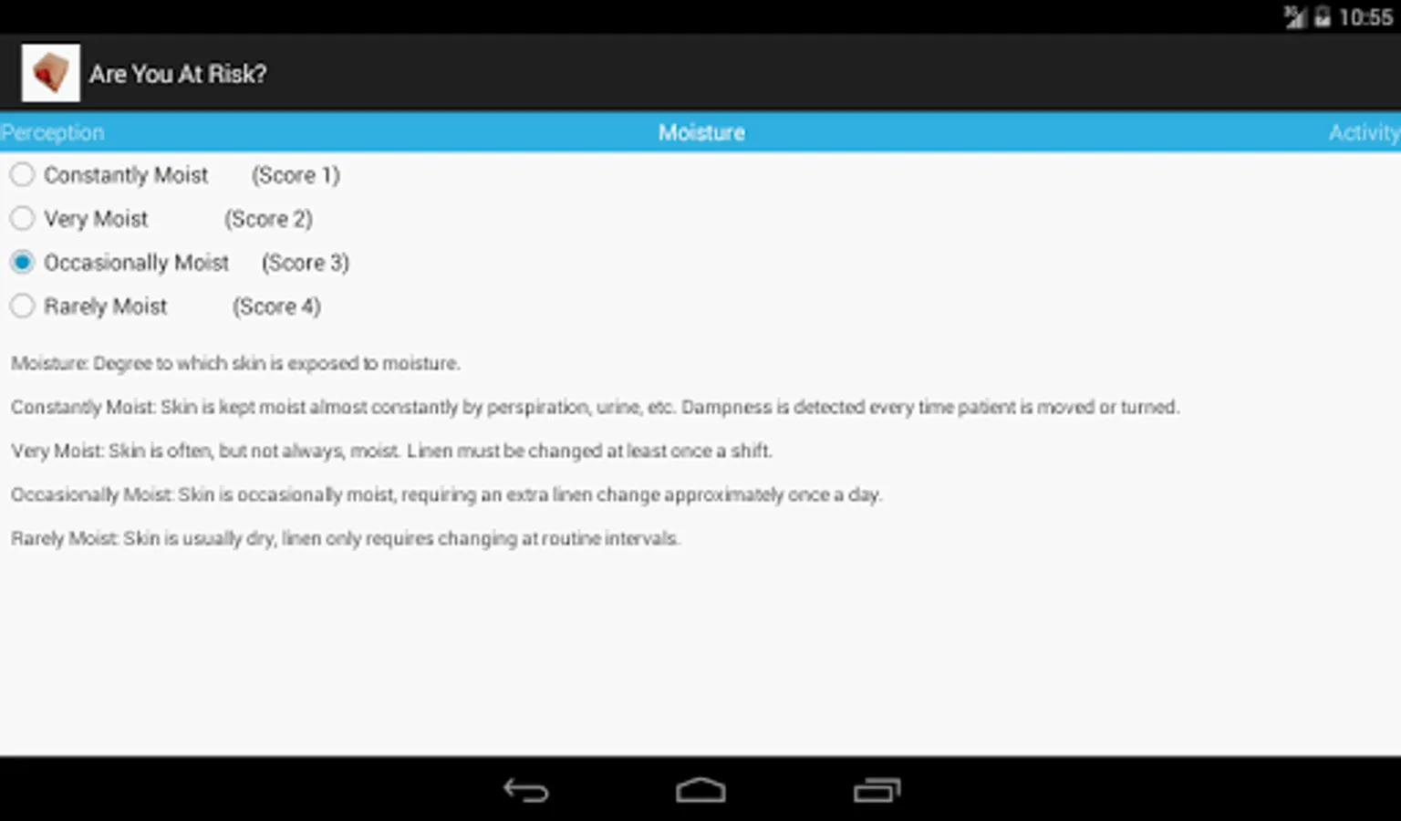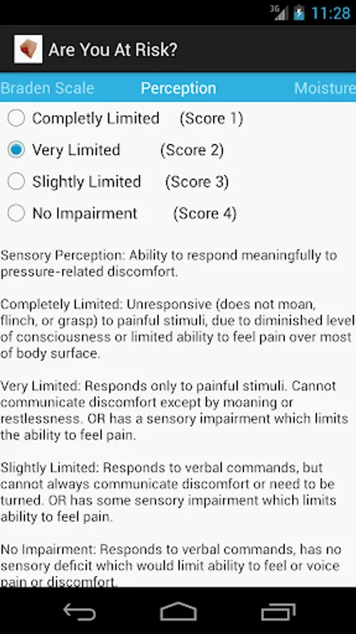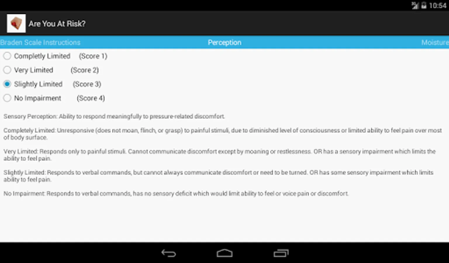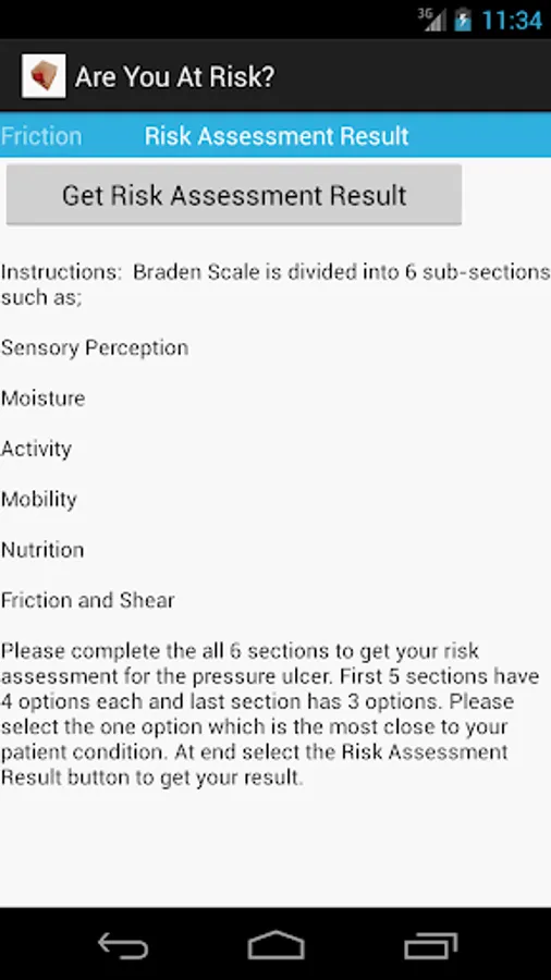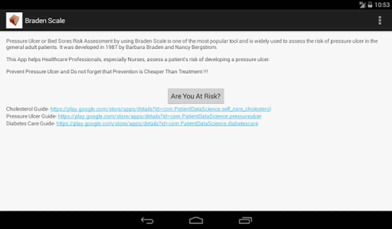 Braden Scale is one of the most popular and widely used tool to assess the risk of pressure ulcer or bed sores or wounds in adult patients. It was developed in 1987 by Barbara Braden and Nancy Bergstrom. We have developed this App to help general public and Healthcare Professionals by making it easier to use, easier to navigate and interactive.