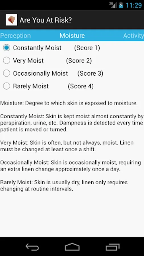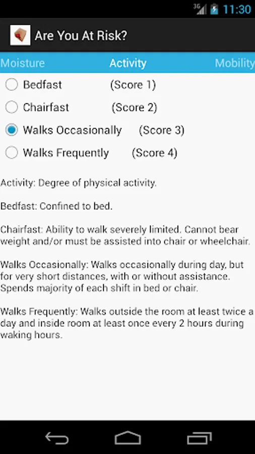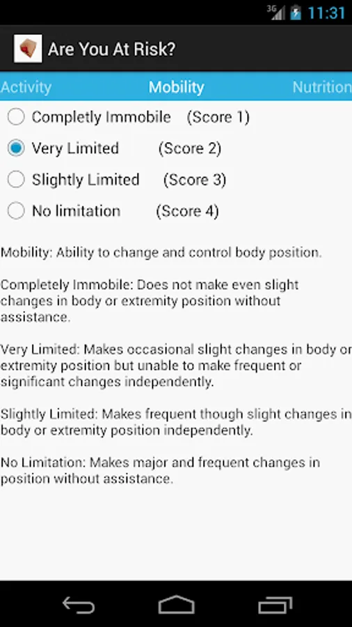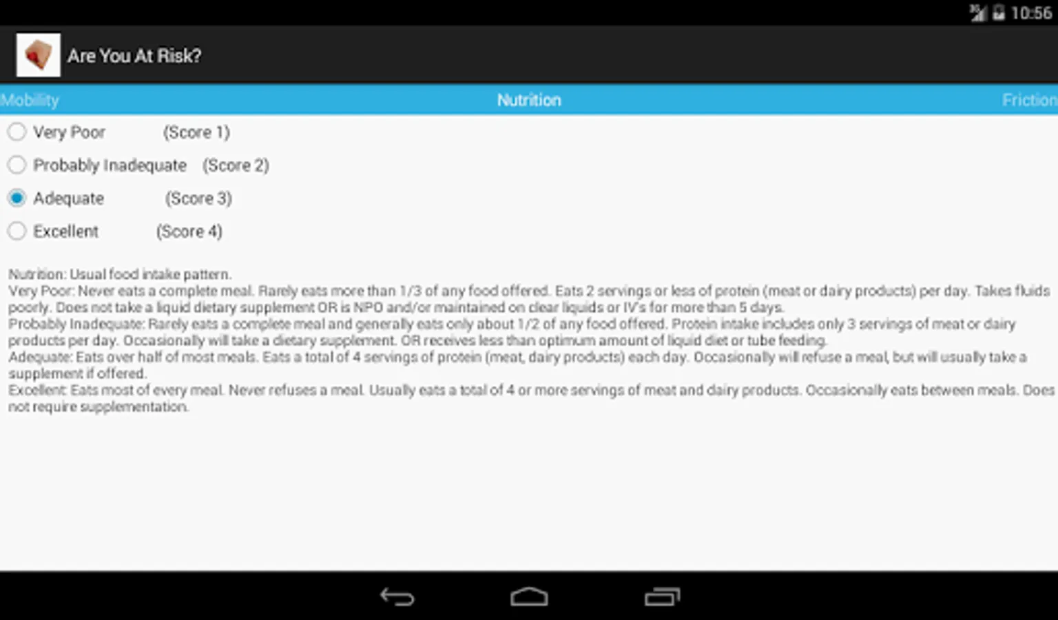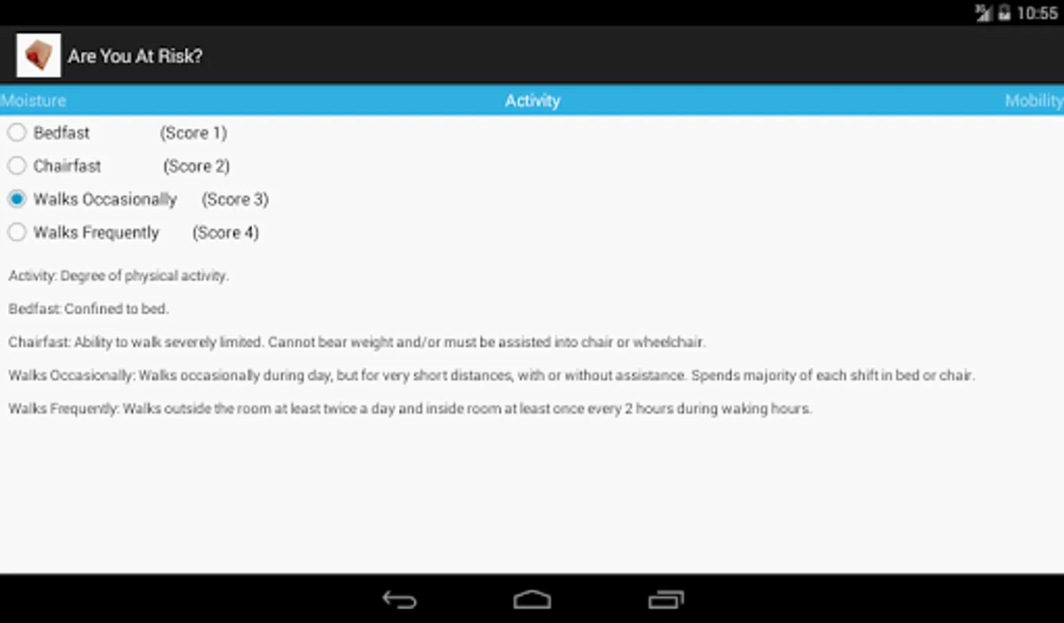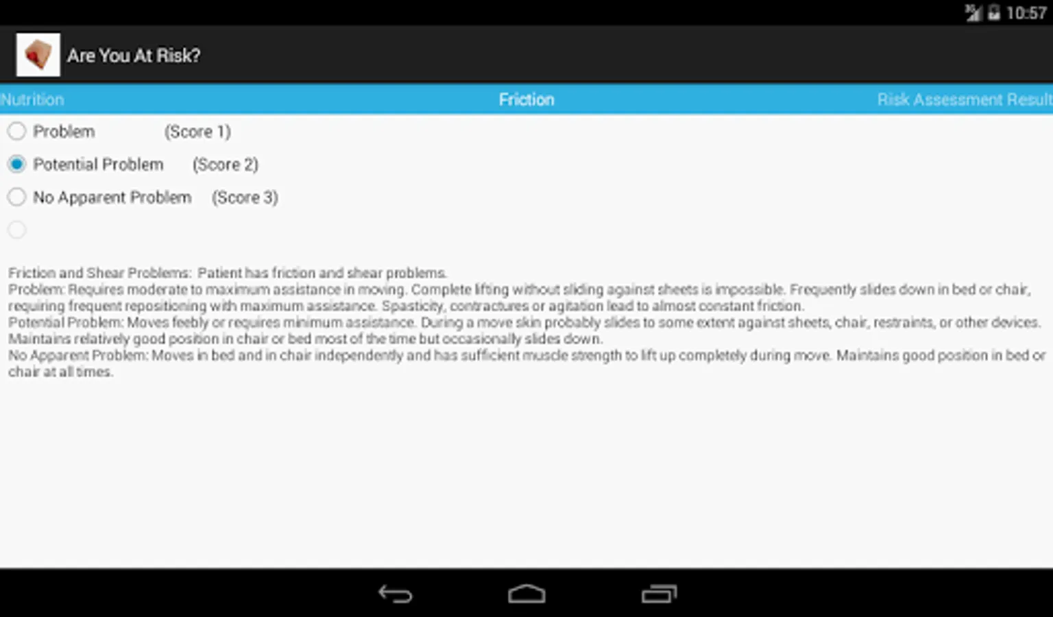 Braden Scale is one of the most popular and widely used tool to assess the risk of pressure ulcer or bed sores or wounds in adult patients. It was developed in 1987 by Barbara Braden and Nancy Bergstrom. We have developed this App to help general public and Healthcare Professionals by making it easier to use, easier to navigate and interactive.