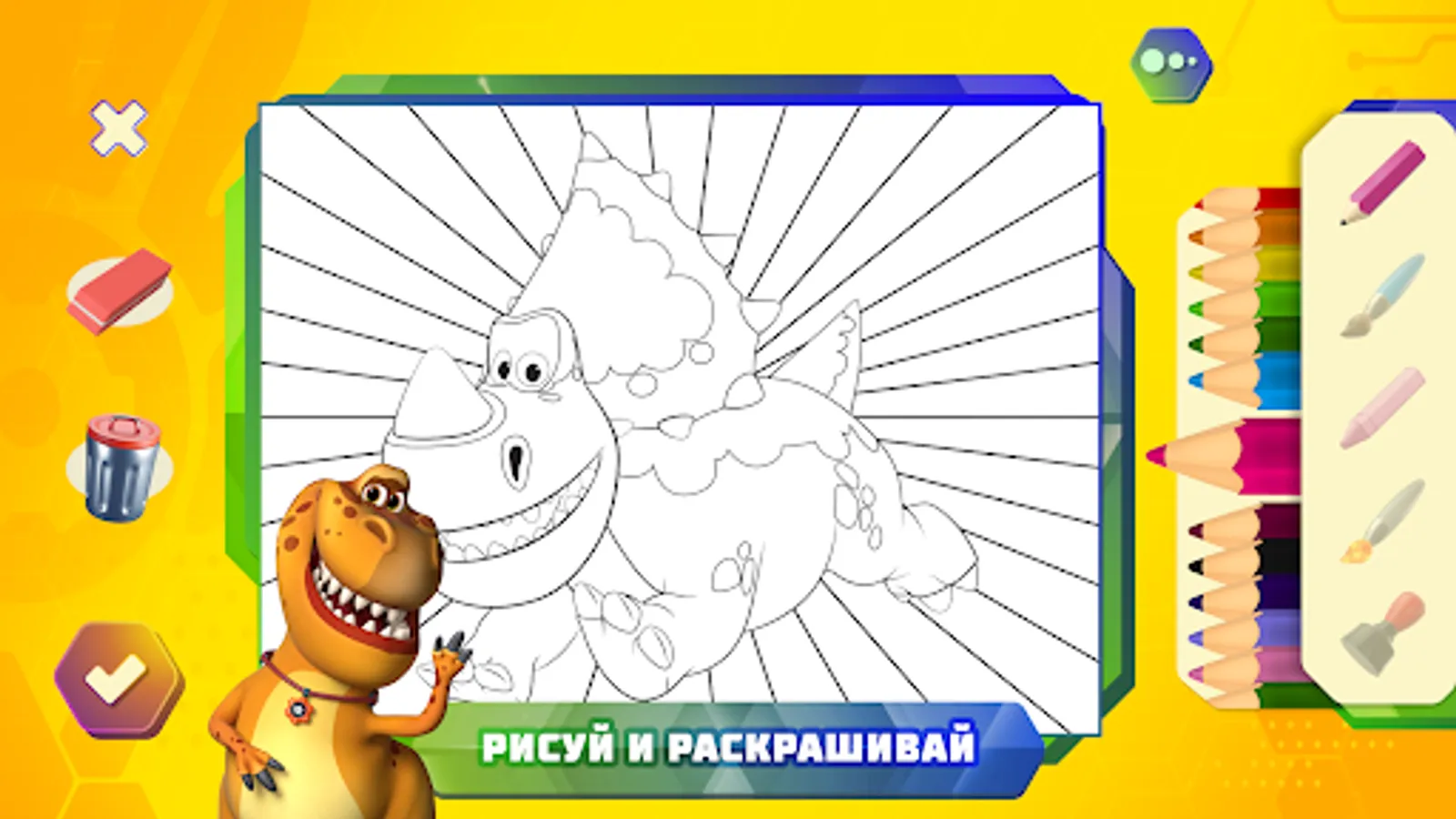 1. Fun coloring. Choosing bright colors from the palette, the child paints pictures with Turbosaurs.