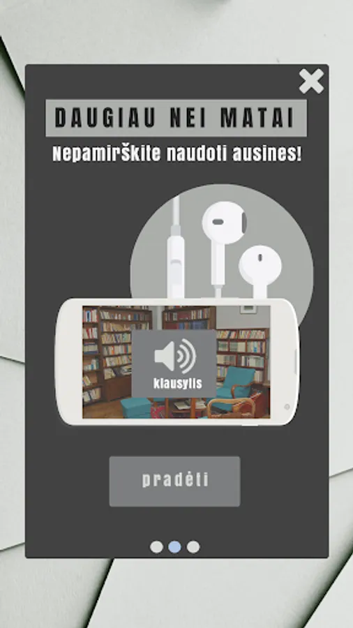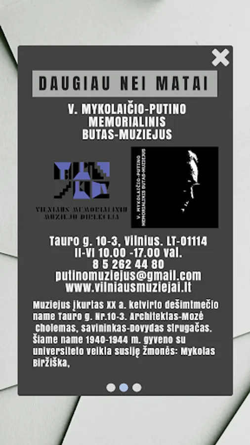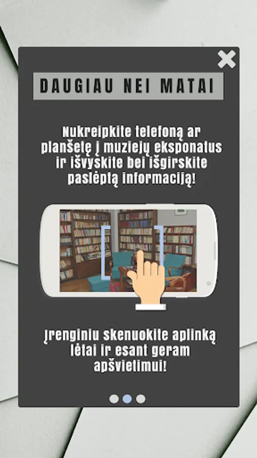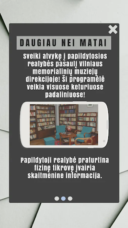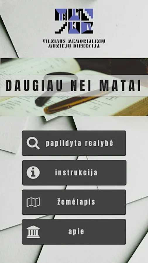 Welcome to the world of augmented reality Vilnius Memorial Museums Authority! This gadget works in all four divisions! Complements reality enriches the physical reality of different types of digital information. Point the phone or TouchPad to the museum exhibits and Experience the hidden information and hear! Device scan the environment slowly and in a good light! Remember to use headphones!