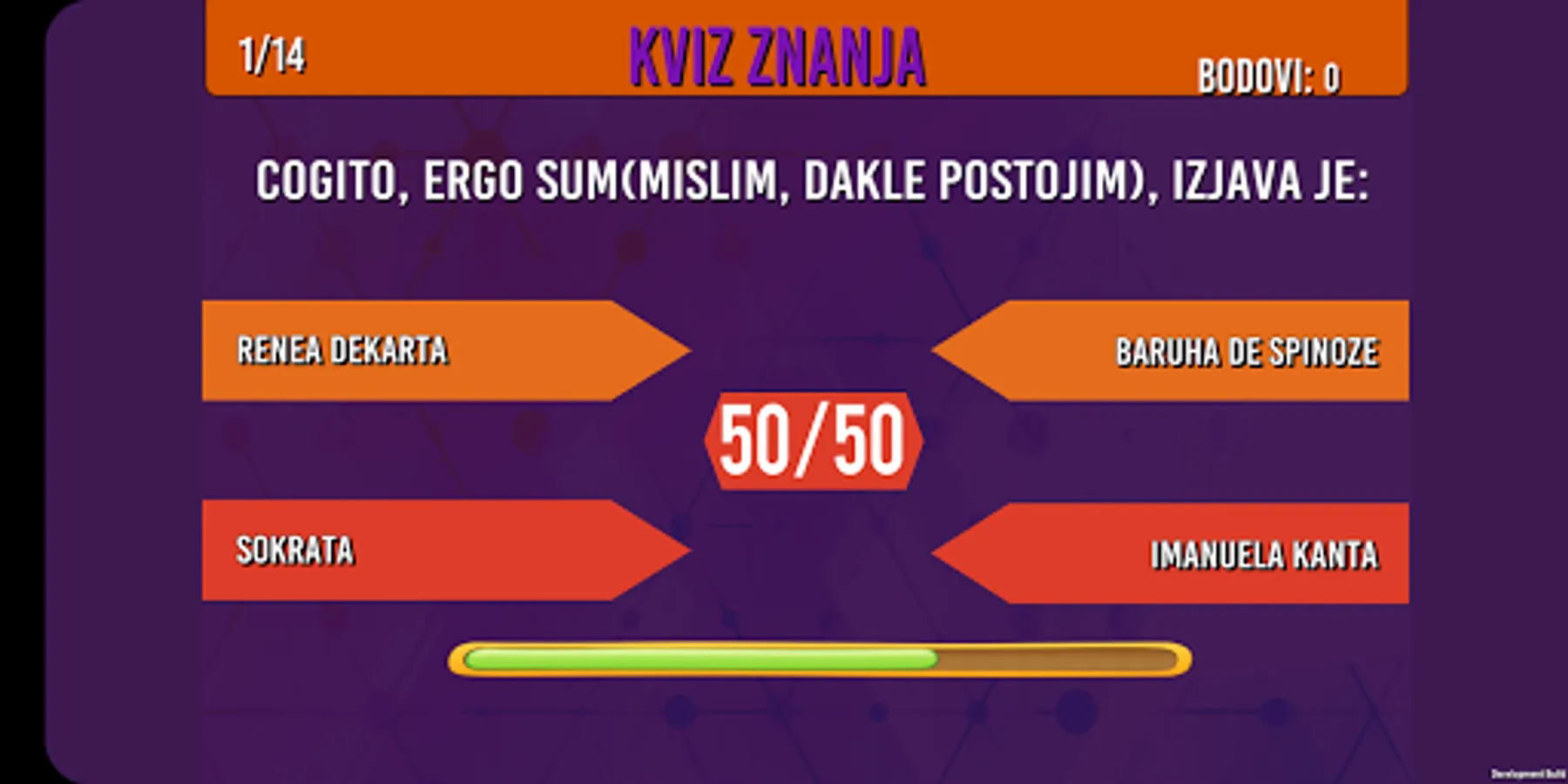 A great knowledge quiz designed only for those who have a great knowledge of the general culture. Test your knowledge with this quiz of over 250 questions, compare your knowledge with other players in two-player mode and compare your progress by following the scoreboard!