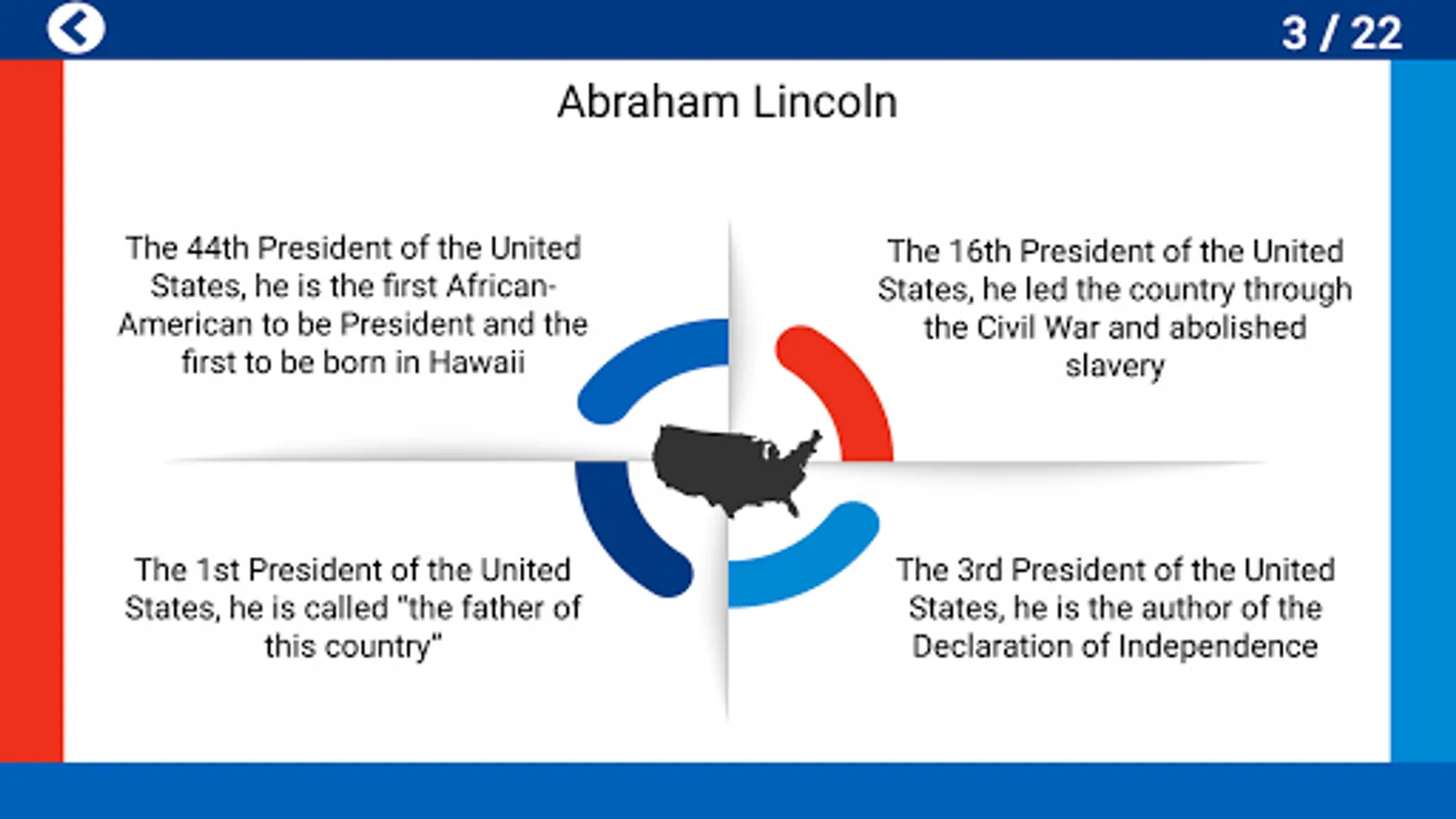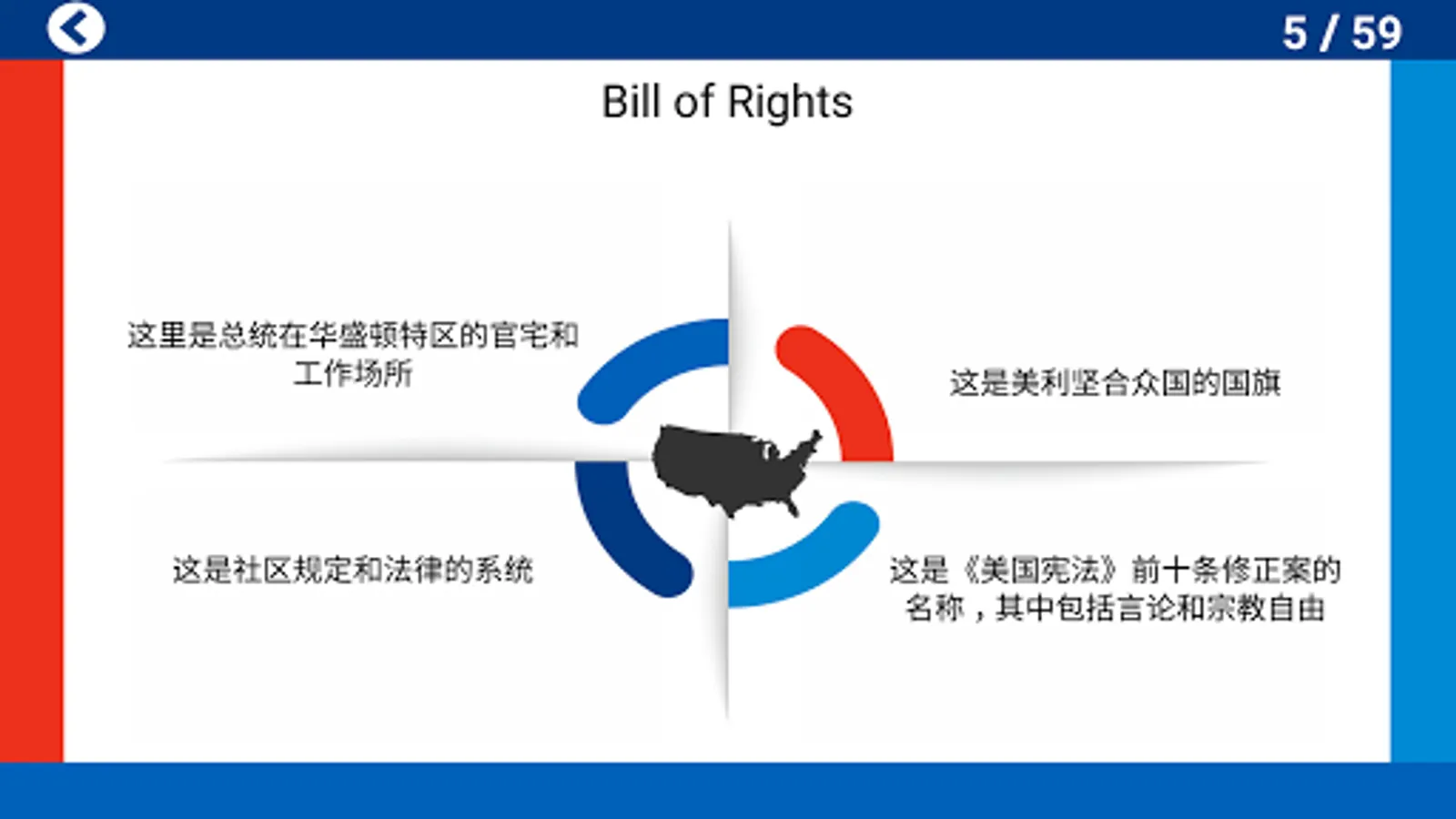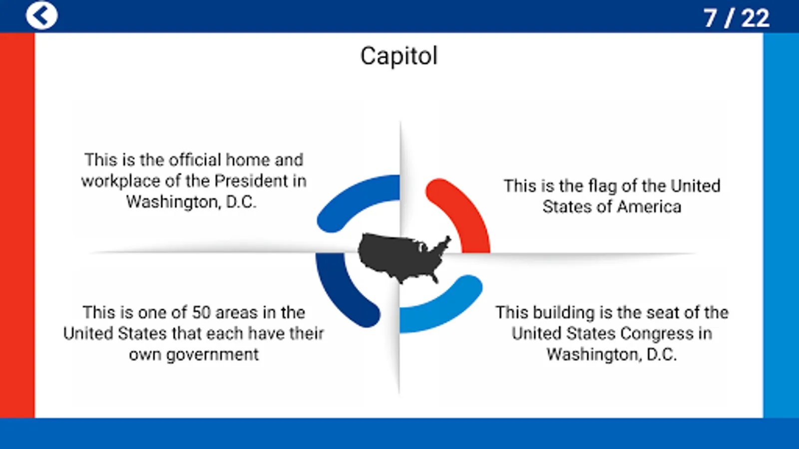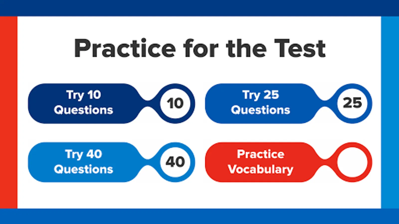 In the test, which is an oral test, an official of the USCIS (U.S. Citizenship and Immigration Services) will ask you 10 questions of the 100 questions that you can practice in this app. You will be asked the questions in English and must answer in English. You need to answer at least 6 questions correctly to pass the Civics part of the naturalization test.