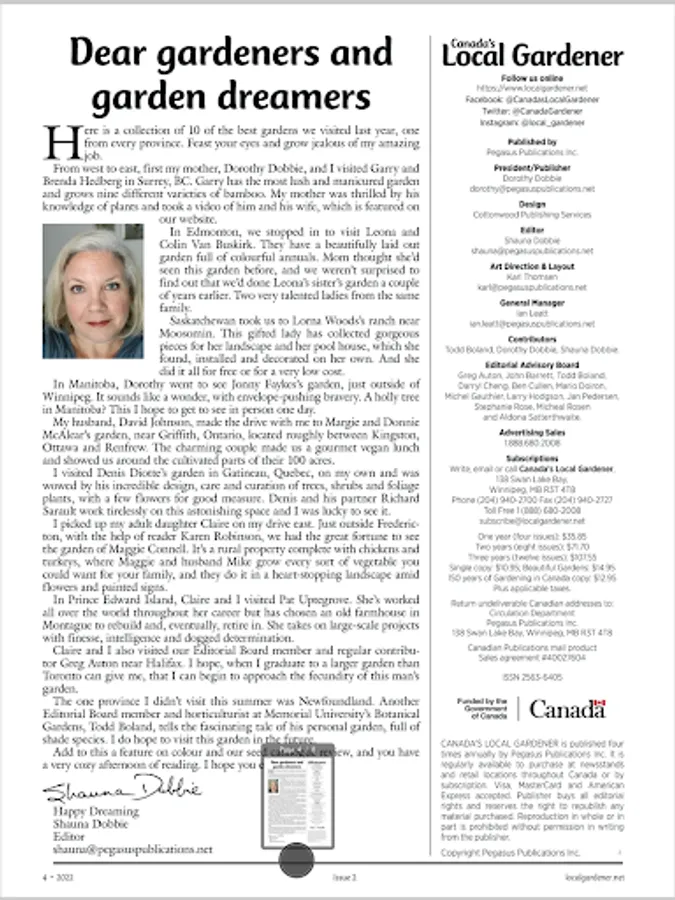 With every issue, learn about new plants, different ways of growing them, and old things you may have forgotten. Get a peek into your neighbours’ back yards. Read about gardeners in Canada making a difference.