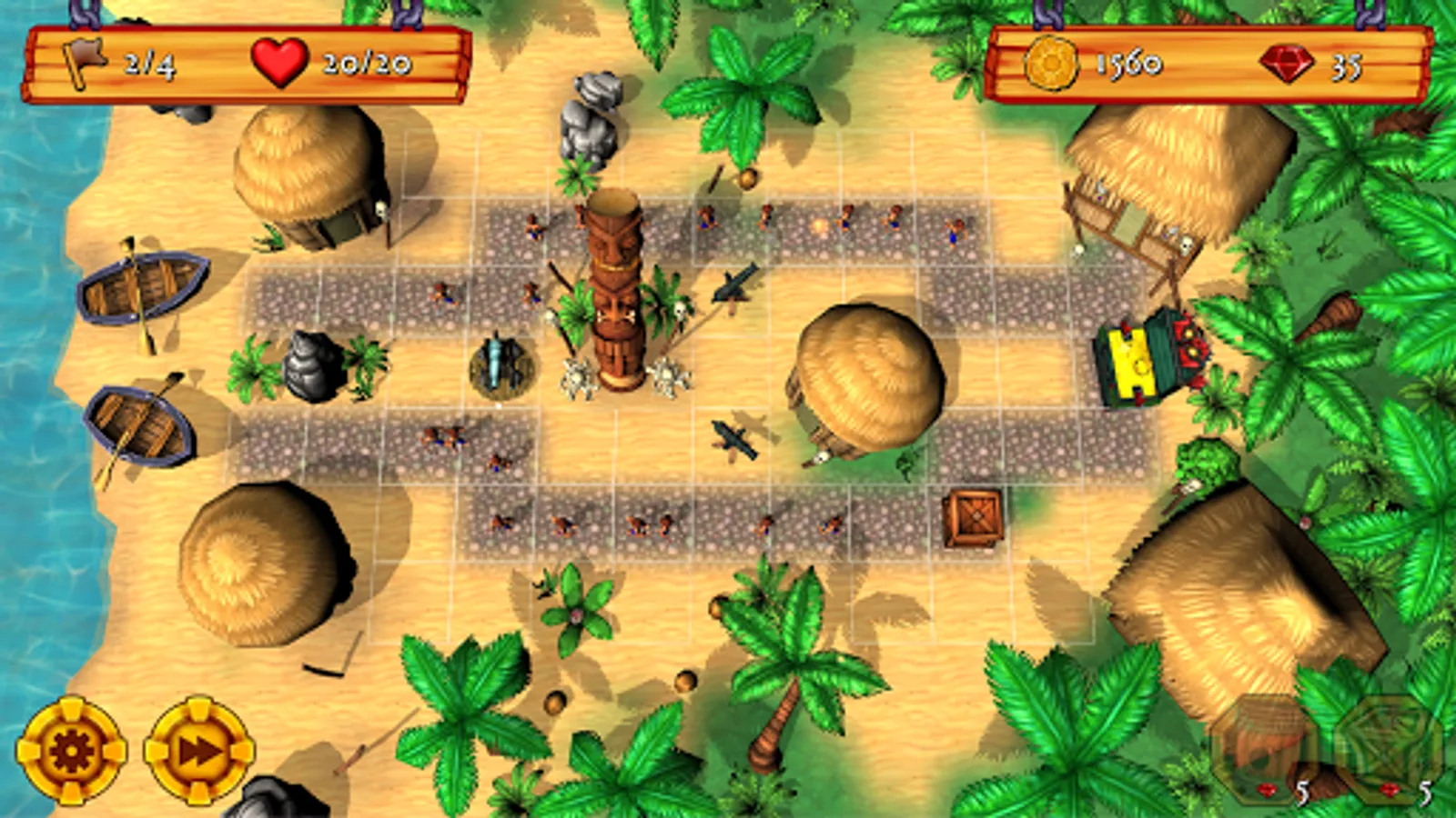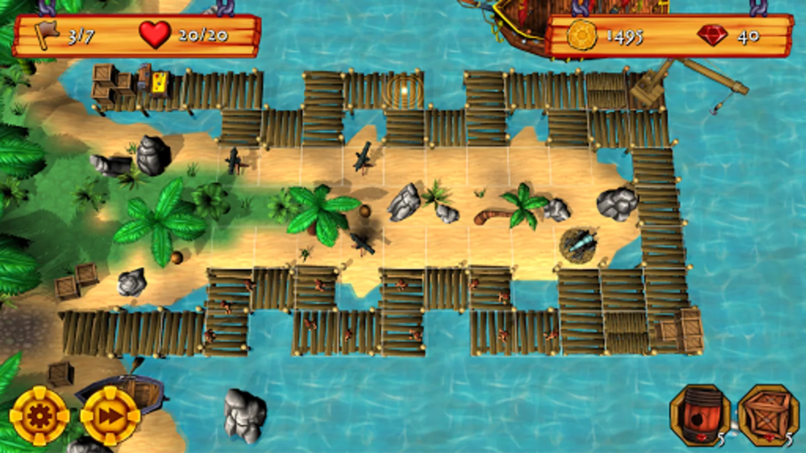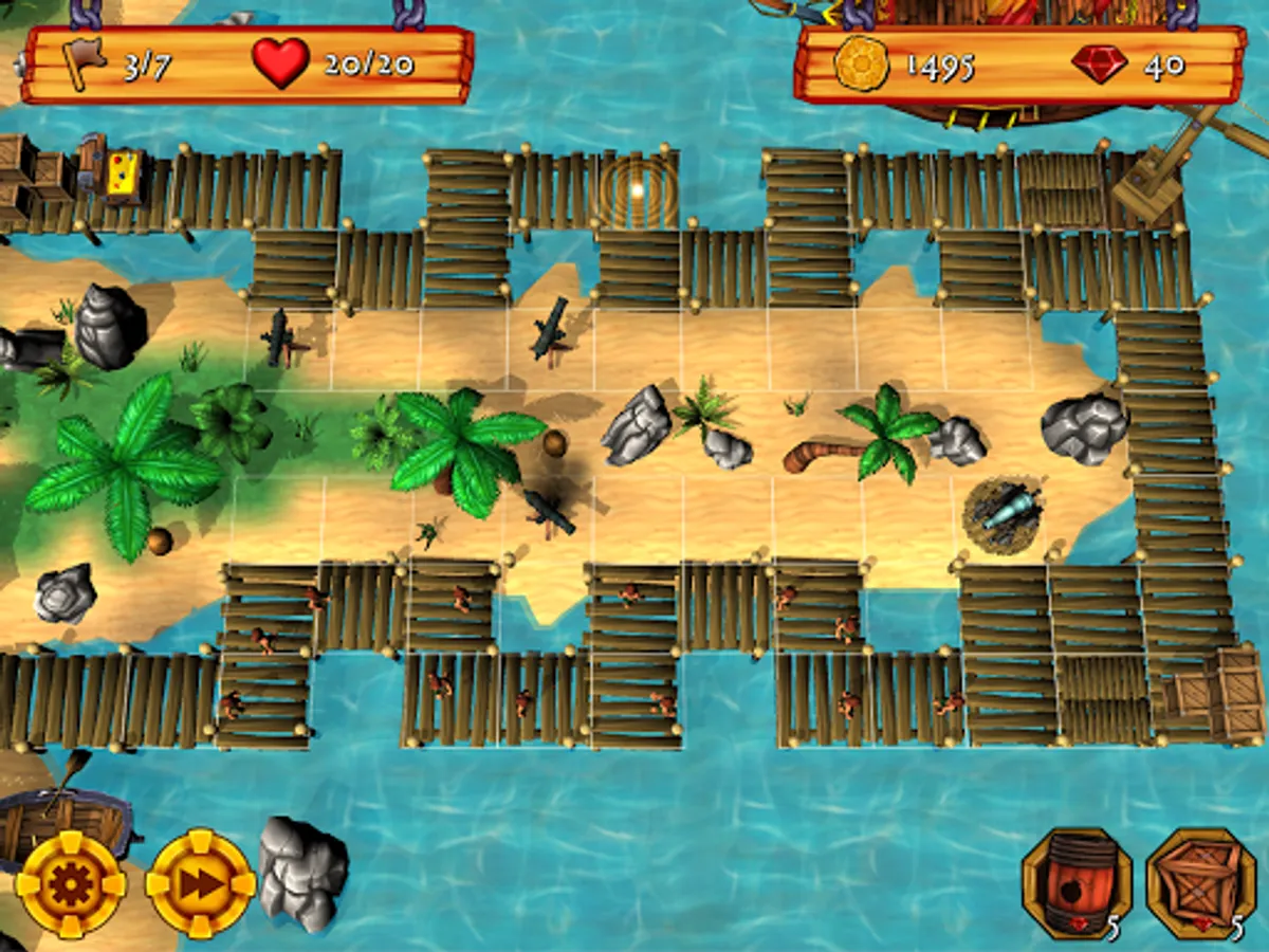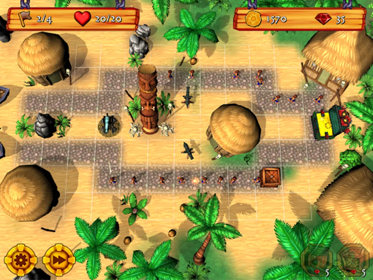 Fallen pirates will occasionally drop gems which you can tap to collect. Gems can be spent on helpful items, like a powder keg that blows grunts to smithereens, a voodoo drum that turns grunts into lumbering zombies, or a smoke bomb that hides your cannons from enemy view! Simply tap a path tile to deploy an item at any point during a level. You can also tap the fast-forward button at any time to speed up the action.