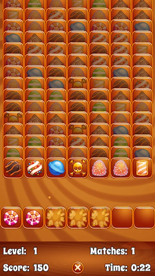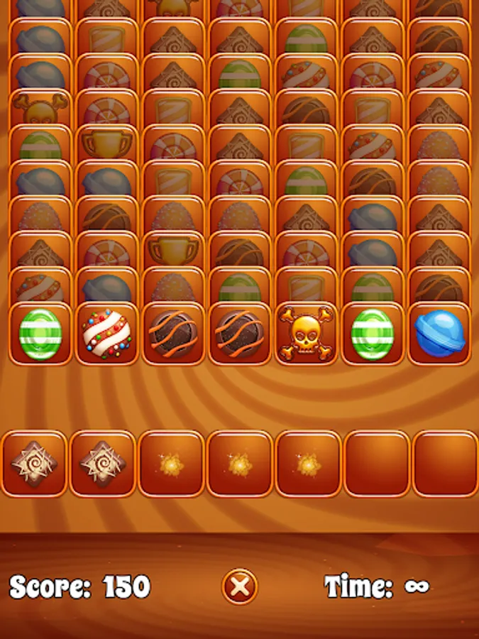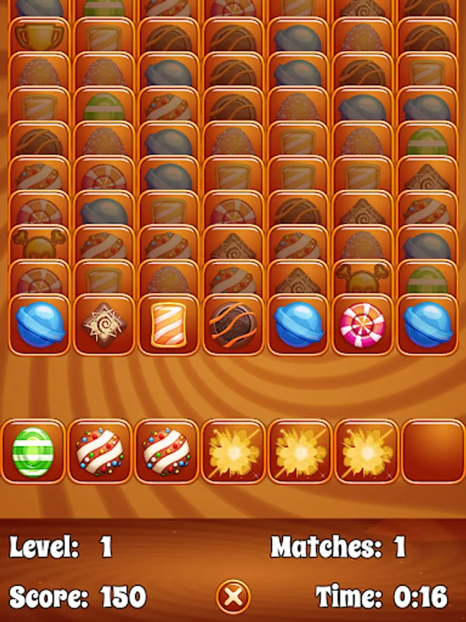 Tap a candy to send it to the game board below. Match three candies to remove them from the board. Keep an eye out for trophy pieces that act as wildcards, but beware of hazard pieces that must be matched with other hazard cards to remove them!