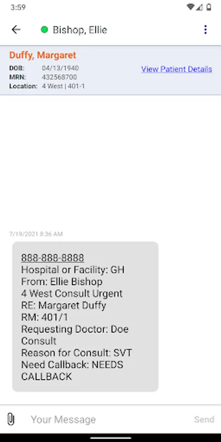 - Send a secure message to colleagues, including text messages, clinical photos, voice
