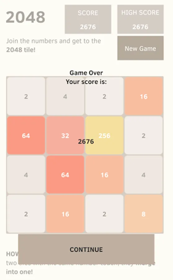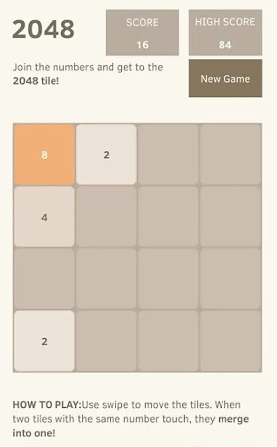 Swipe (Up, Down, Left, Right) to move the tiles. When two with the same number touch, they merge into one. After every swipe, a new tile will appear in a random empty spot on the board. Slide the cells to merge them, 2+2=4, 4+4=8, 8+8=16, 16+16=32 ... 64 ... 128 .. 256 .. 512 .. 1024 ..., when 2048 tile is created, you win!