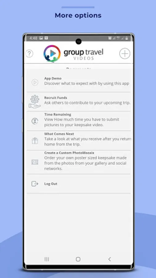 The Group Travel Videos app is designed to provide a private, secure and easy way for a group to share their photos traveling on a trip together. No email addresses are needed, nor access to your contacts, phone number or a requirement to log into a social media account.