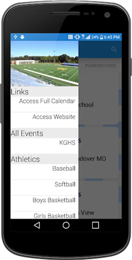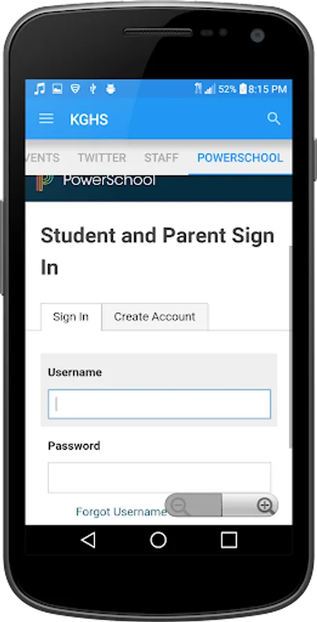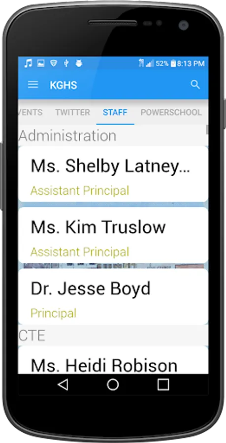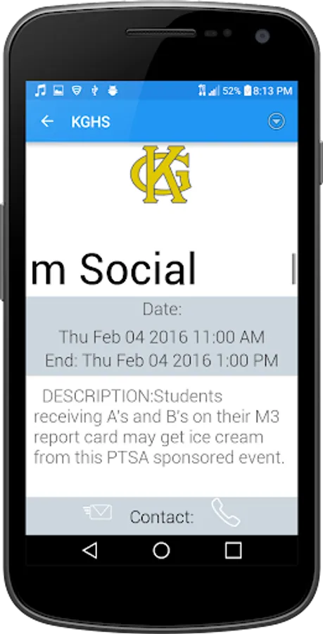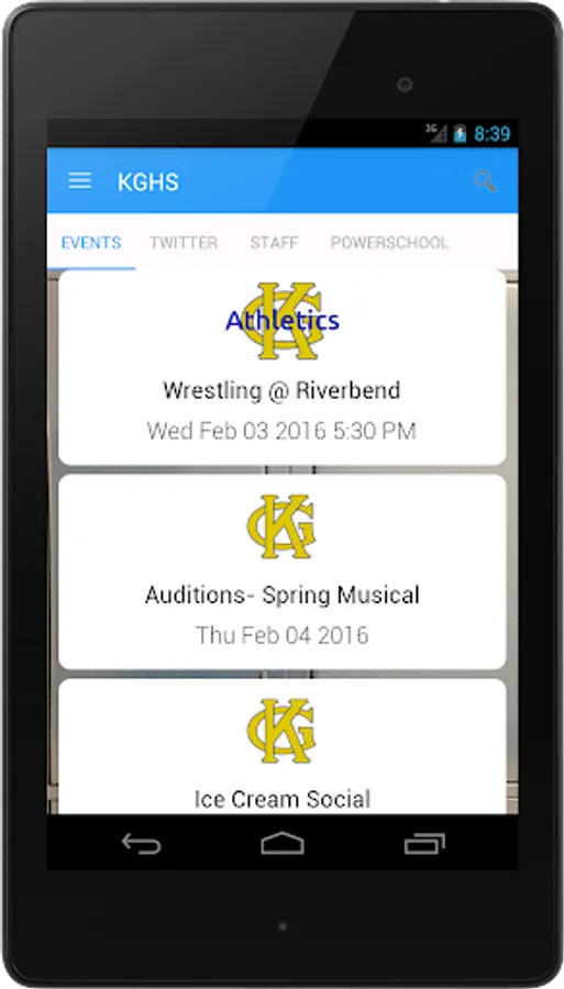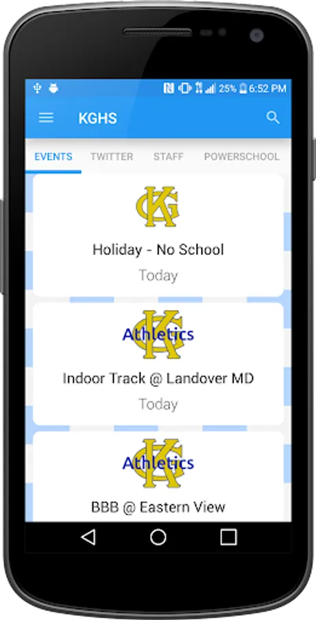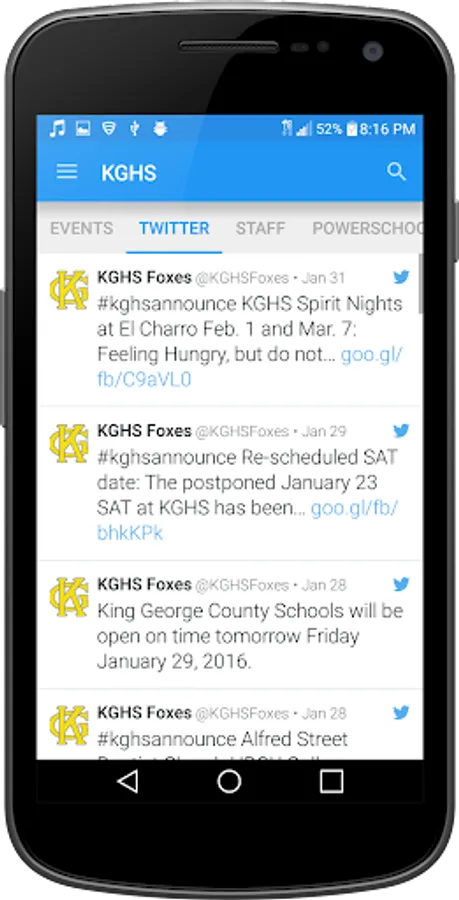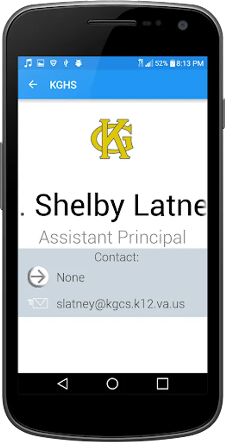 This app displays teacher contact information and websites and a live feed of upcoming school events. There is also a PowerSchool login page built-in and a King George High School Twitter feed page.