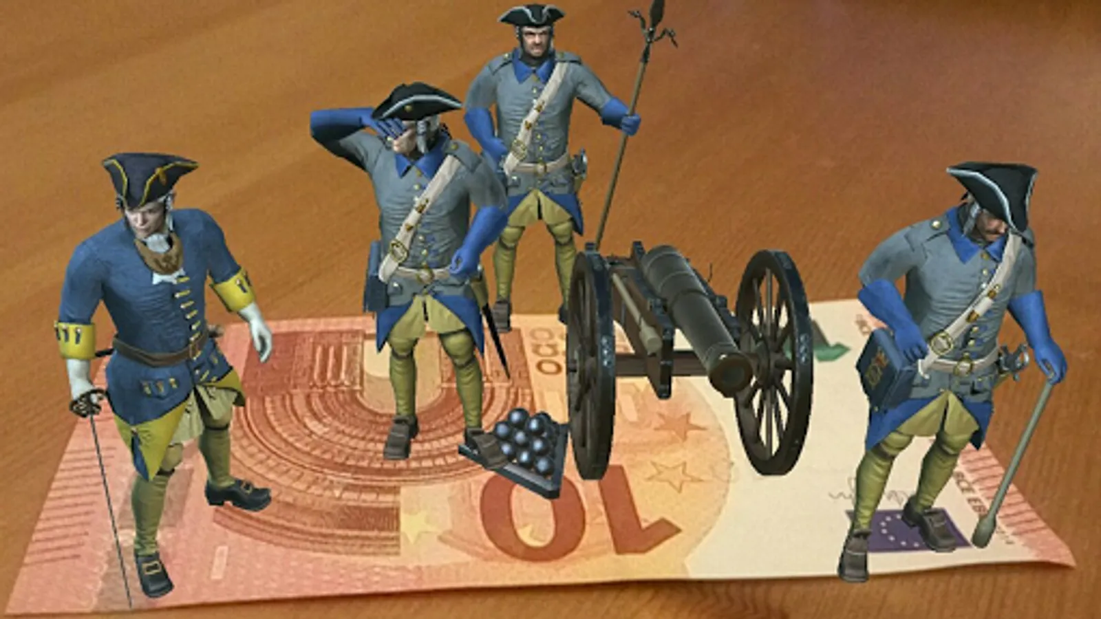 Take a national banknote of Euro, Dollar Pound or rubles on the front side and direct the camera of your smartphone on it. Here is a gunners charge old cannons on top of the banknote. Next lay out a bill of 10 or 20 euros and start the battle with the grenadiers of Charlemagne!