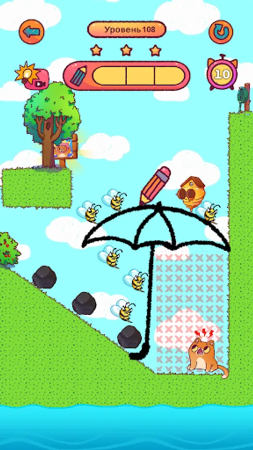 Save Simbachka is a casual puzzle game. You draw lines with your finger to create a wall that protects Simba from bees and other dangers. You need to protect Simba with a painted wall from all dangers for a few seconds, hold out and you will win the game. Use your wits to save Simba the cat.