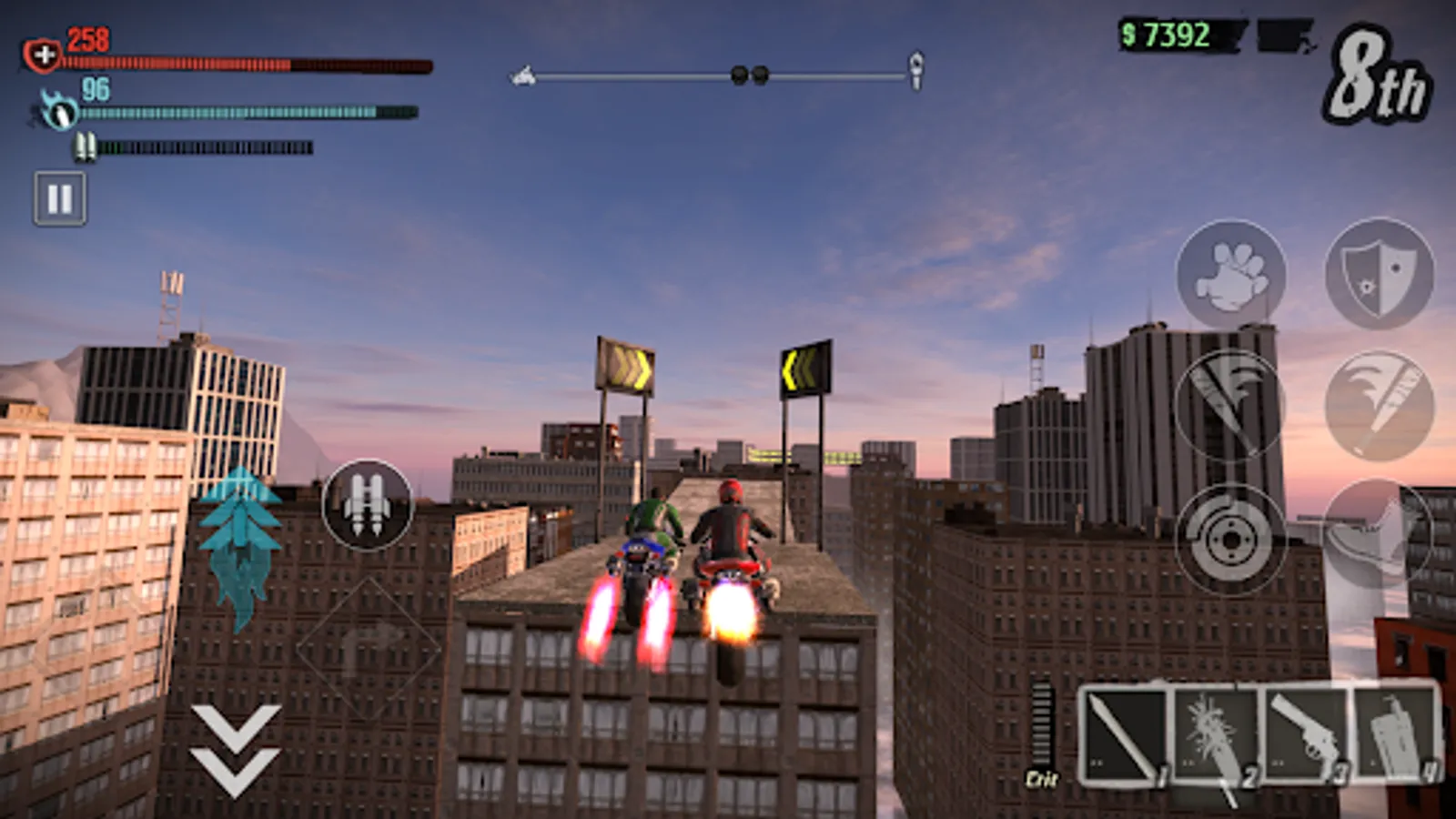 A deep motorcycle fighting system with grabs, kicks, counters, critical strikes, and more. Win races packed with action and hazards to gain cash.