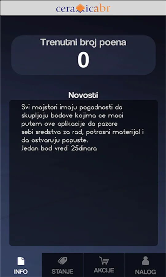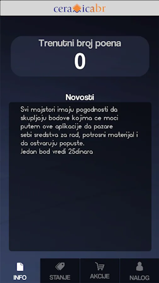 Application for registered members ABR Ceramica "loyalty" program where users earn points that can be used to purchase an item from the action. This application provides insight into the number of points of users, transactions on his account as well as news and current items on sale.