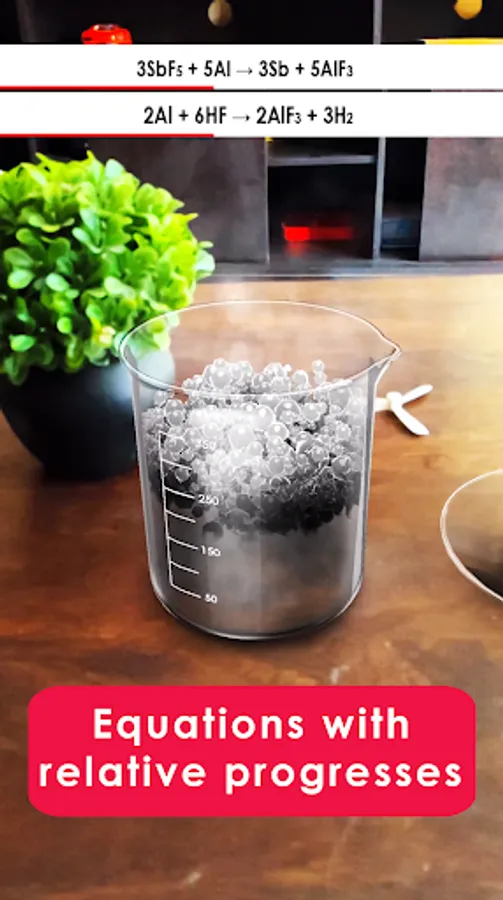 Scan a flat horizontal surface with your device camera to identify a spot to keep the beaker and then start mixing or burning chemicals. We have tried our best to render reaction simulations identical to real world scenarios as much as possible. Chemical equations of the reactions are displayed on top of the screen while simulation is running.