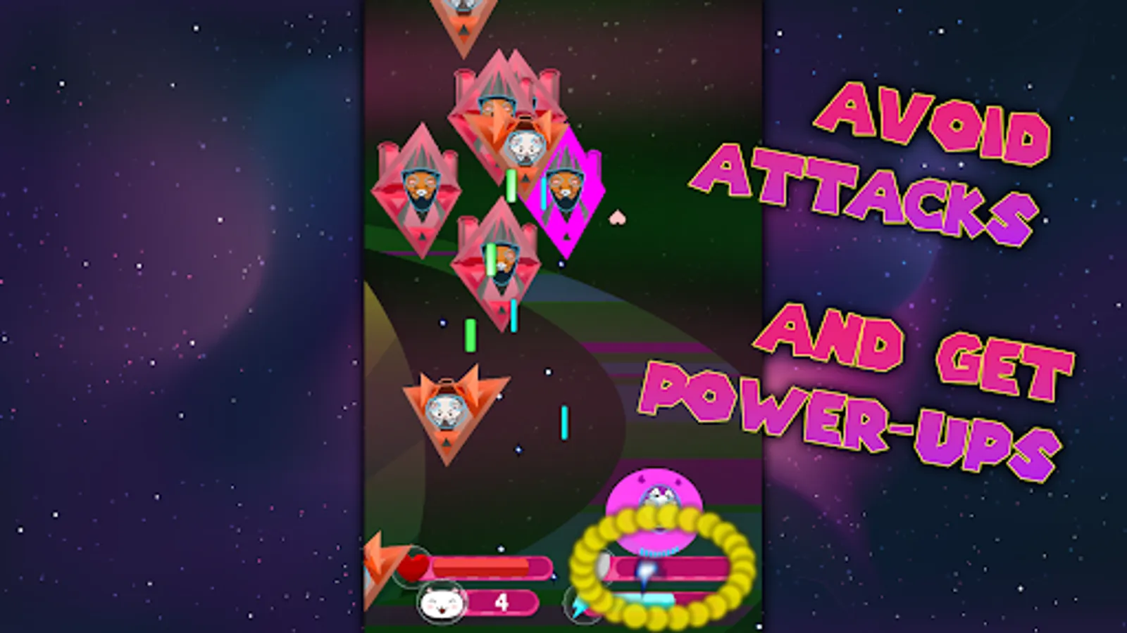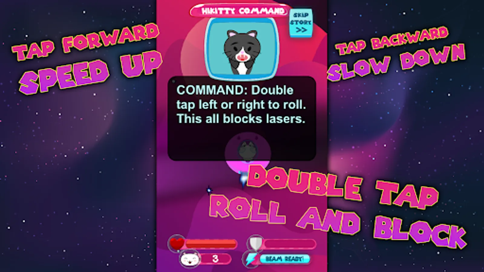 Use your finger to tap and slide your way past the bad kitties and dodge their lasers. Speed up or slow down by tapping forward or backwards for your ship. Use a double tap left or right to perform a roll move that dodges and deflects enemy lasers!