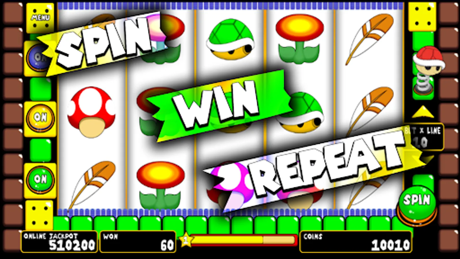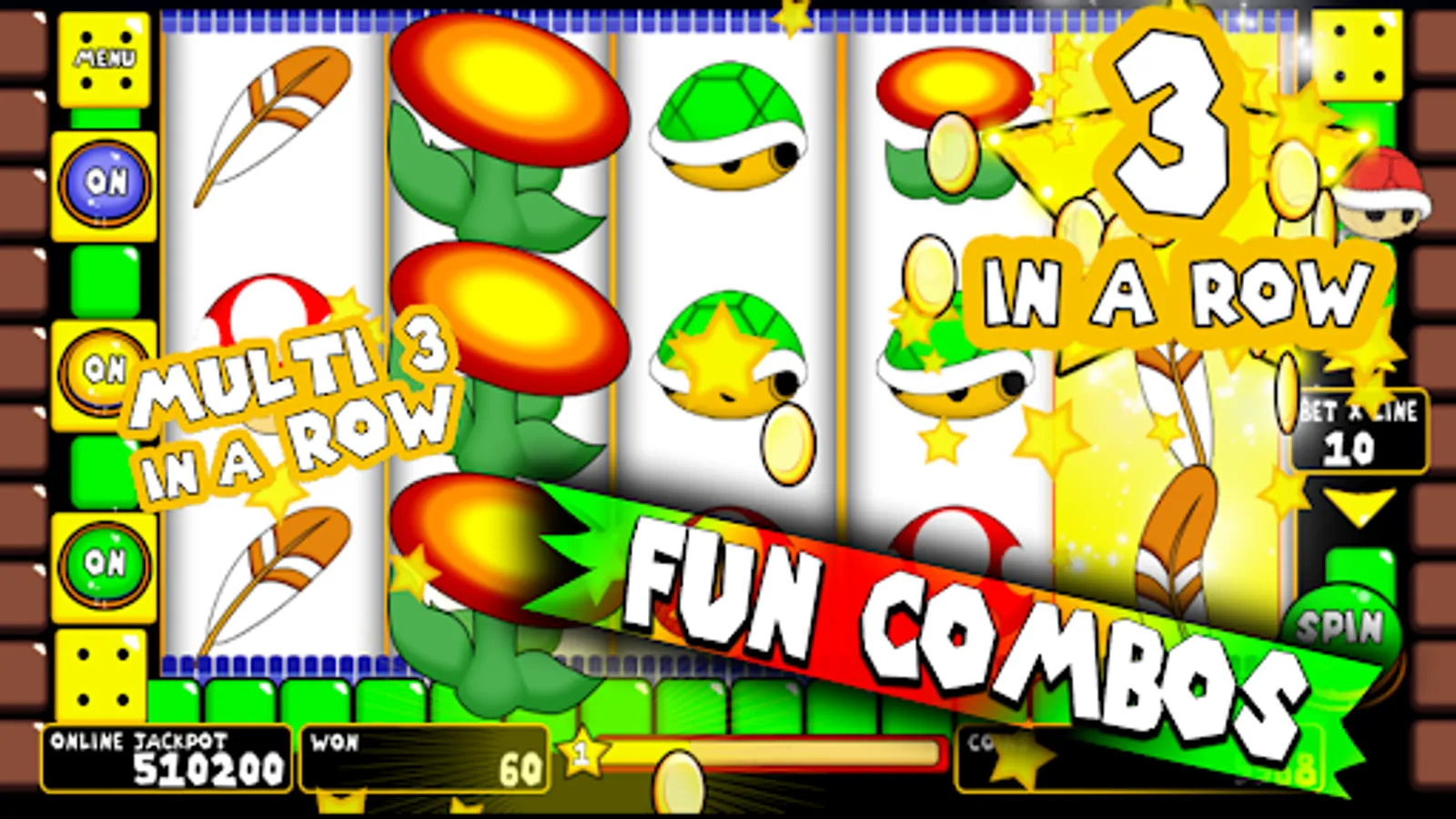 Inspired by classics from the plumber brothers 90's console games. Spend sometime in this kingdom of colorful and warm retro experience playing slots. Drop in a coin (ba-ling!) and get matches to achieve combos for jackpot rewards. Stars and coins explode everywhere!