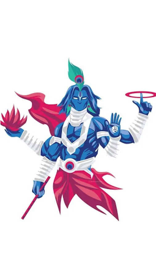 In Hinduism and Indian mythology Krishna is the eighth avatar or reincarnation of the god Vishnu. In the epic poem 'Mahabharata' he helps the Pandavas against the Kauravas, also he delivers his celebrated oration 'Bhagavad-Gita' on duty and life to the troubled Hero Arjuna