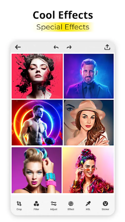 Many more effects are here in picture editing app like Square, Mirror, Body, Text, Ratio, Paint, Exposure, Sticker, HSL, Pixlab, Frame, Blur, Portrait, Splash, Backdrop, Motion, Sketch, and many more.