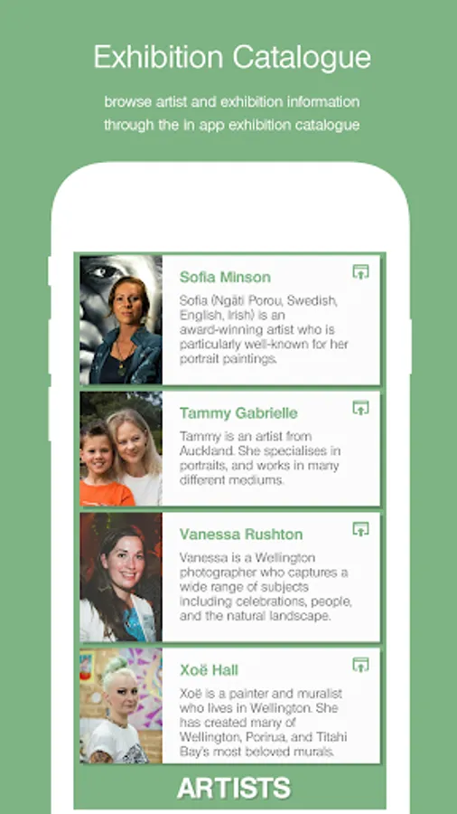 In addition, users of the Kōrero Pono app are able to browse an exhibition catalogue for information on participating artists, sponsors, and the exhibition itself.