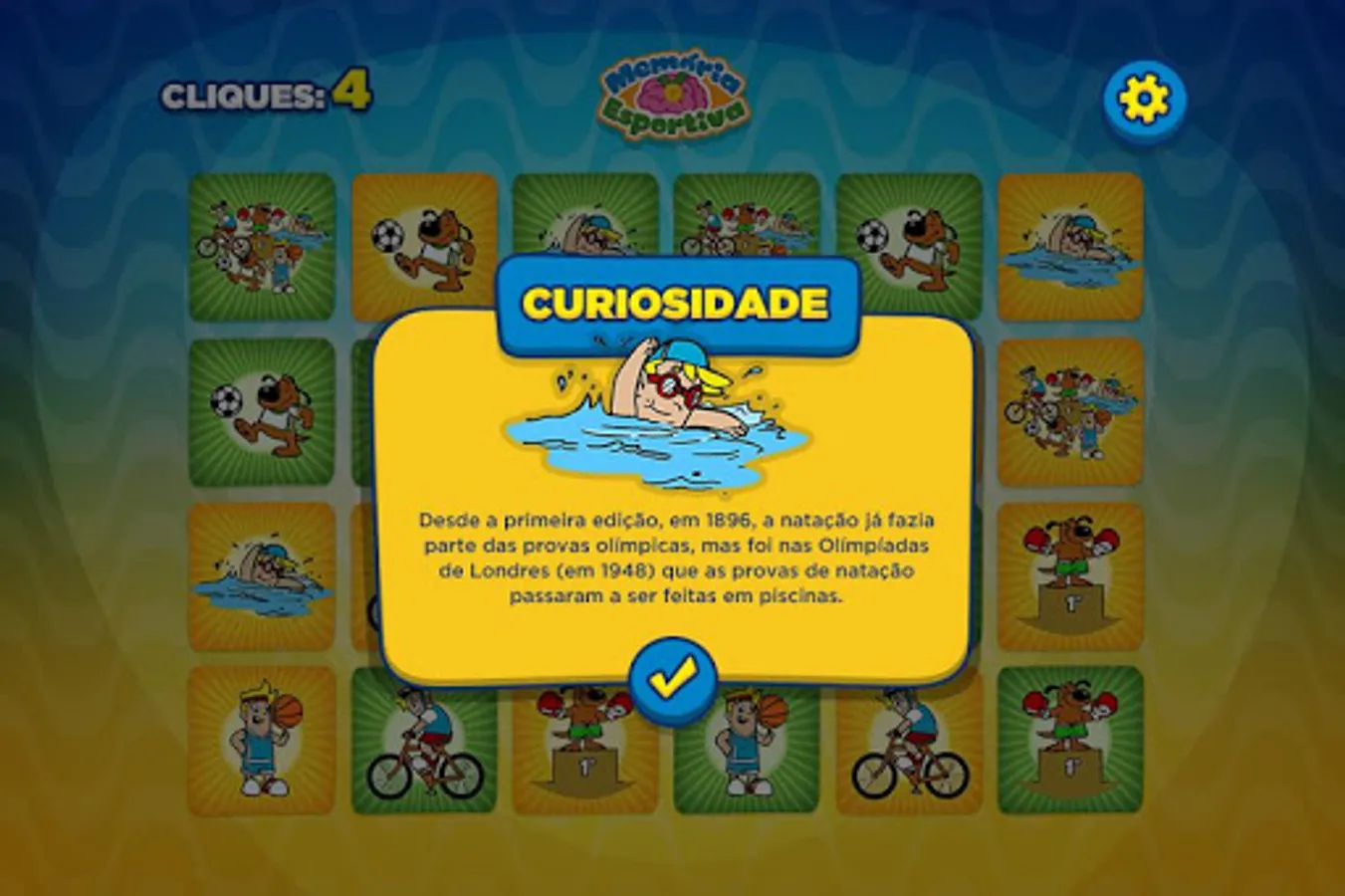 Game of digital memory, with Xalingo the characters of illustrations representing some sports. The goal is to find the pairs of each illustration. Each double right, is presented a curiosity about the sport in question. The score is counted according to the number of clicks needed to complete the game (the less clicks, higher the score). Every re-start, the cards are shuffled differently redistributed in other positions, always ensuring a new challenge. It's a game that works the capacity of attention, concentration and visual memory of the child, in addition to providing information about the covered sports.
