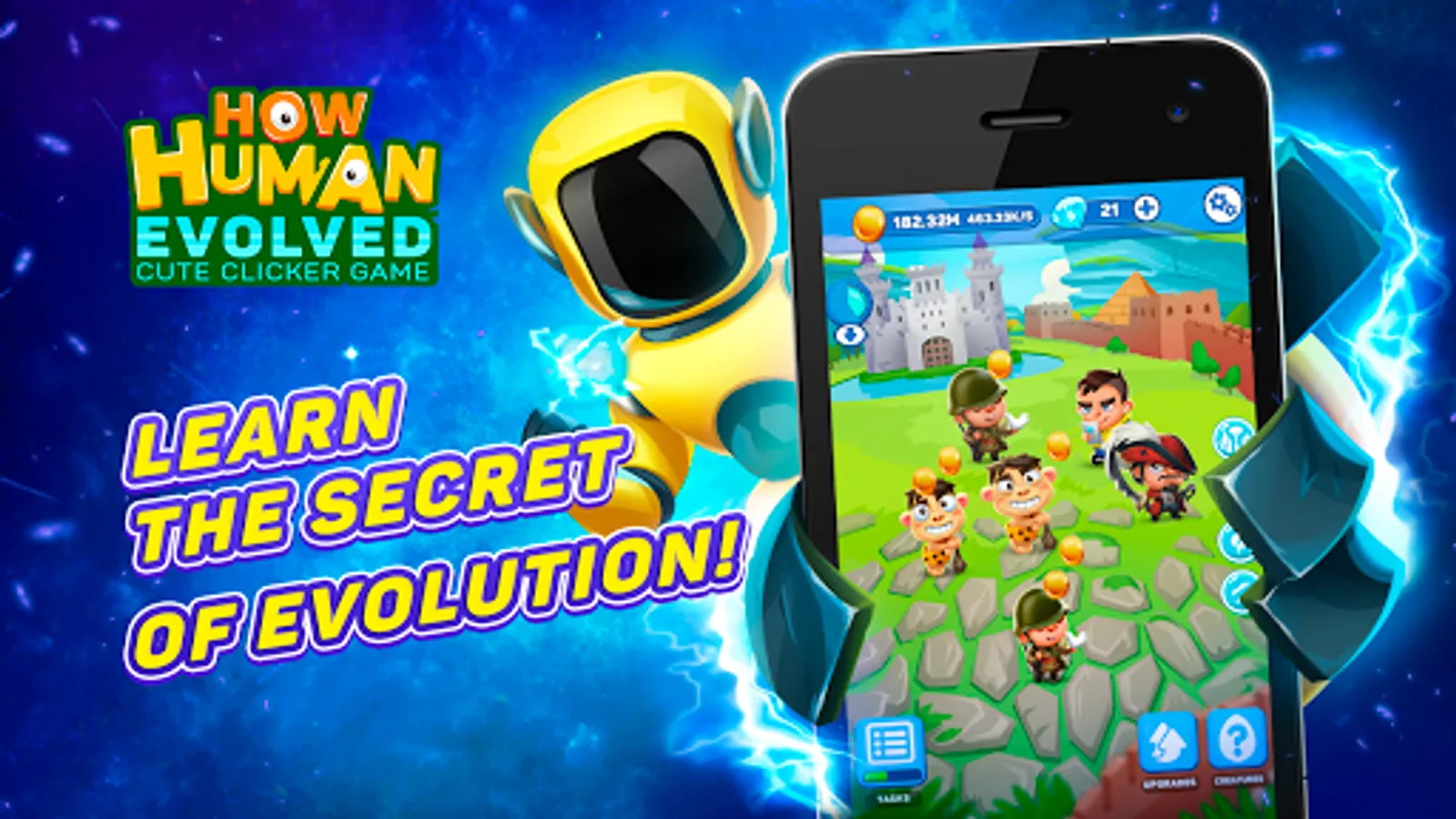 Find out how people appeared on our planet - go through all stages of evolution from simple bacteria and viruses, to fish, lizards and mammals. And of course get to the evolution of a human! Go through all the main stages of the progress of human society from ancient to modern human. But this is not all - you have a unique opportunity to learn how the human will evolve further and take the main part in this. The cyborgs? Robots? Everything can be, you just need to craft all heroes in our clicker game!