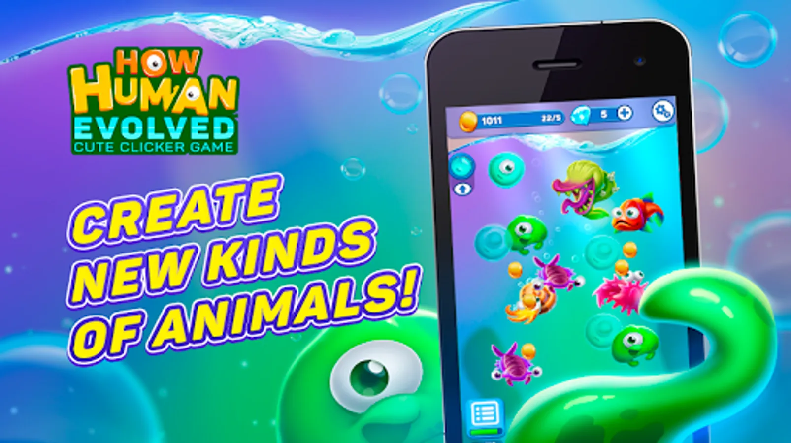 Combine different creatures and get new unique kinds of them. At the first underwater level - it is certainly the simplest single-celled and multicellular bacteria and viruses. Then it's crustaceans and fish. Mutate fish in reptiles, and then in lizards. And so on and so on - get various mysterious creatures :). Our game is not just about one creature, like unicorn evolution, cat evolution, giraffe evolution, cow evolution or shark evolution - in our game "How human evolved: cute clicker game" you can evolve a large number of different animals and of course reach a human!