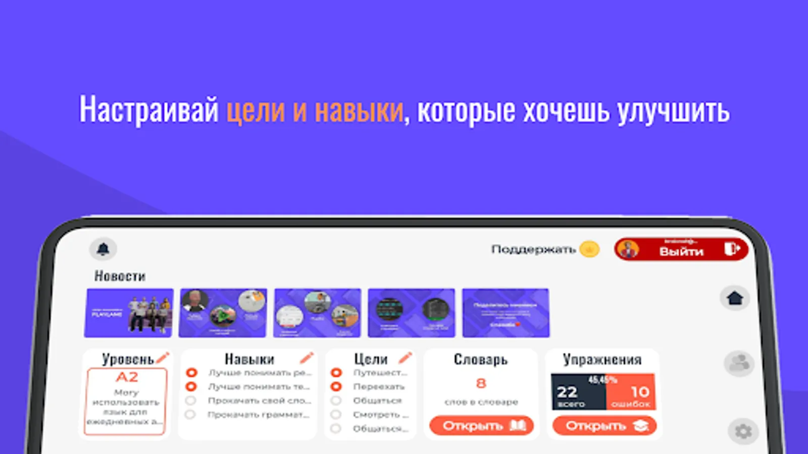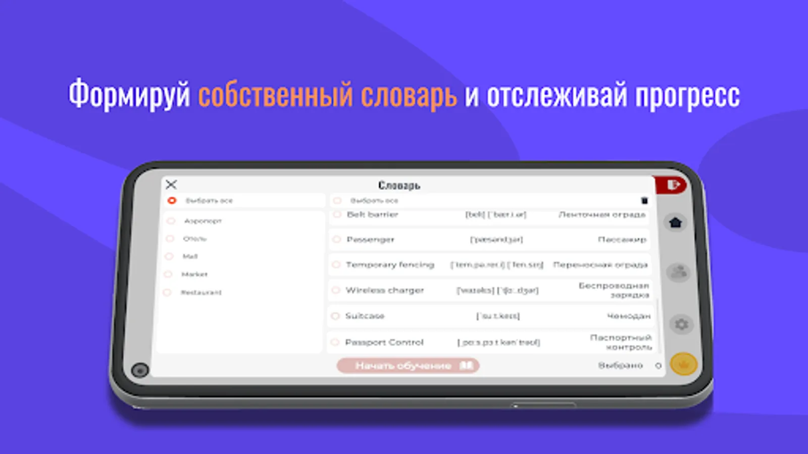 Add words and phrases to your personal dictionary to practice them more often. Improve your language skills in different types of exercises. Raise your level from scenario to scenario.