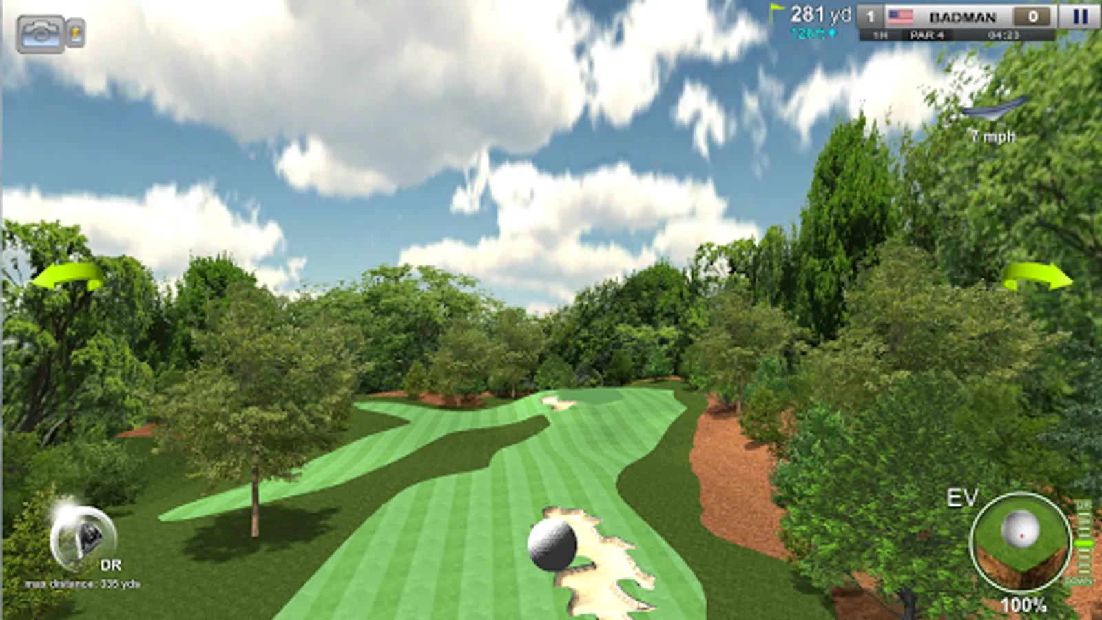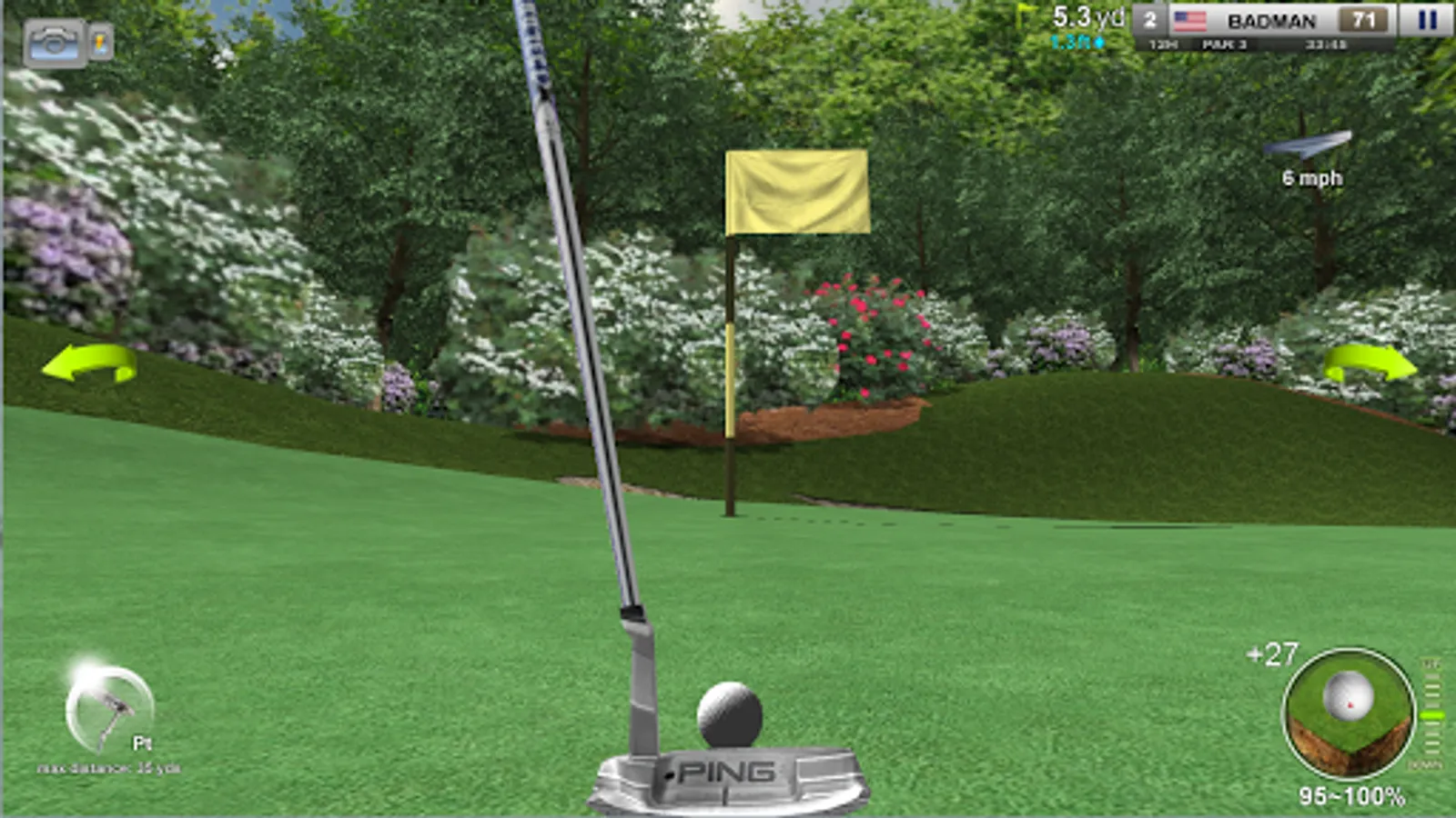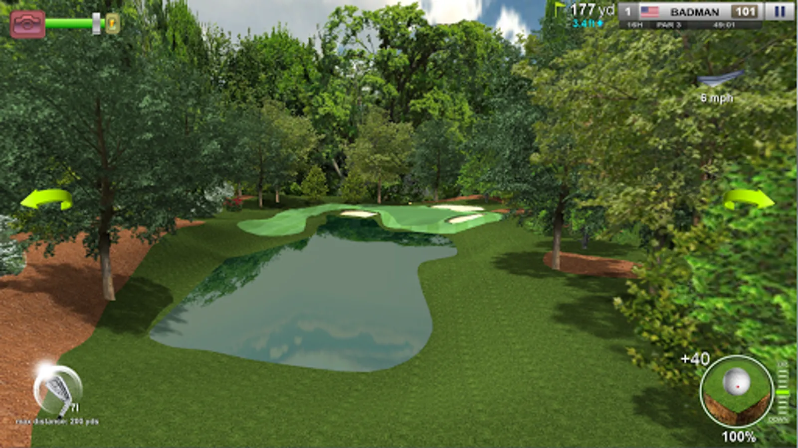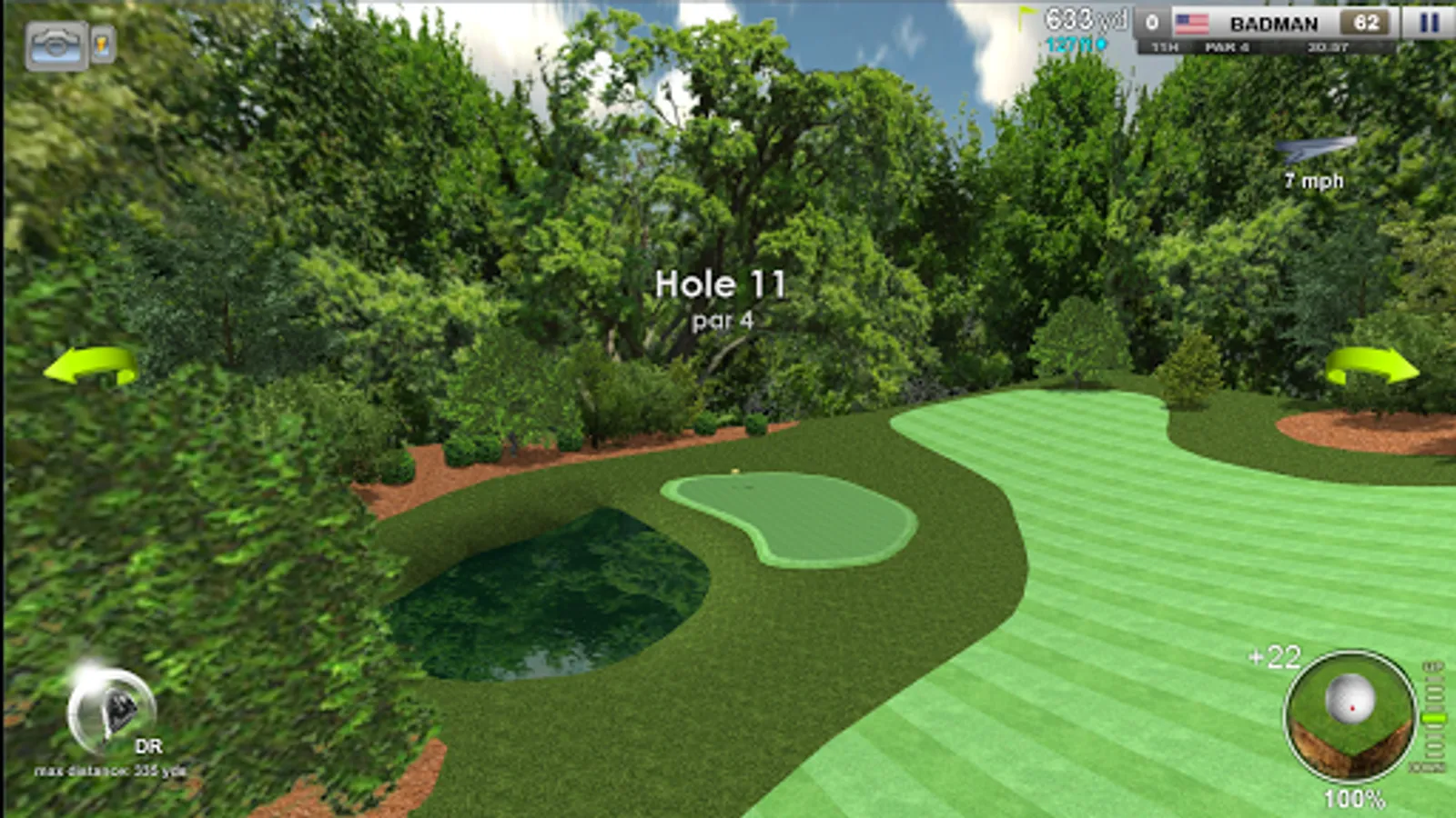 Take stock of the hole with intuitive camera controls. Choose your club and take aim for your next masterful stroke. Aiming is done with two panning buttons for your thumbs on either side of your device's screen. Power of the shot comes from a simple meter that is held down longer for higher power shots.