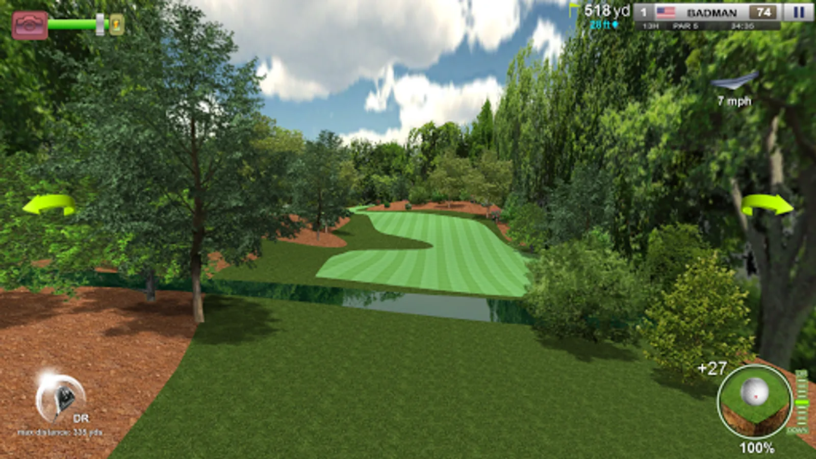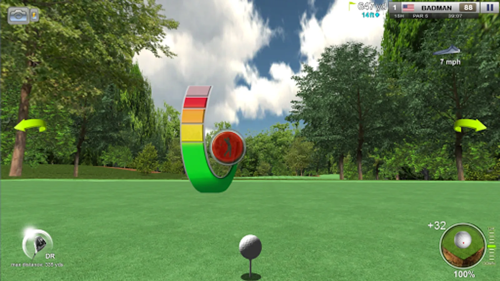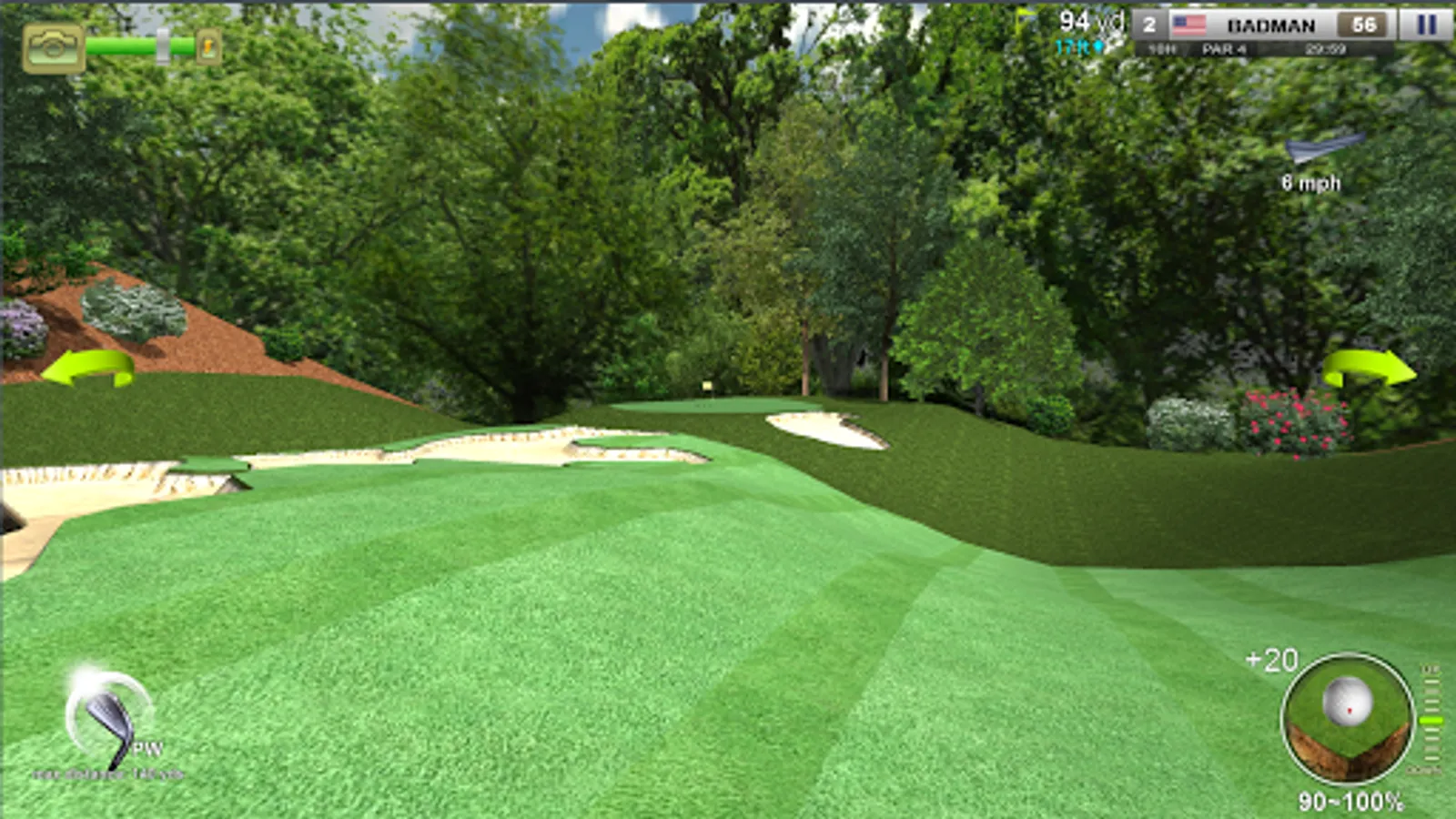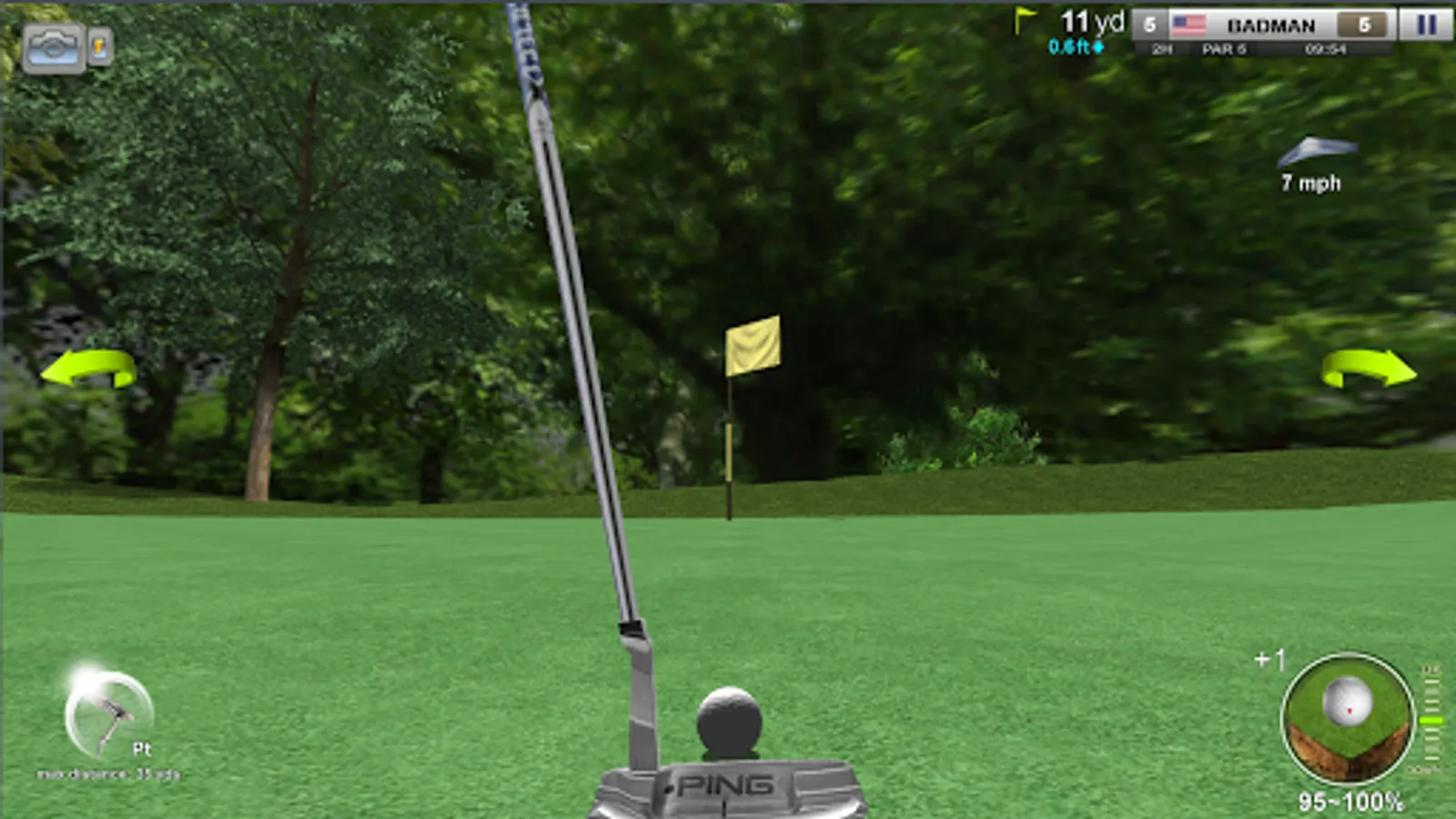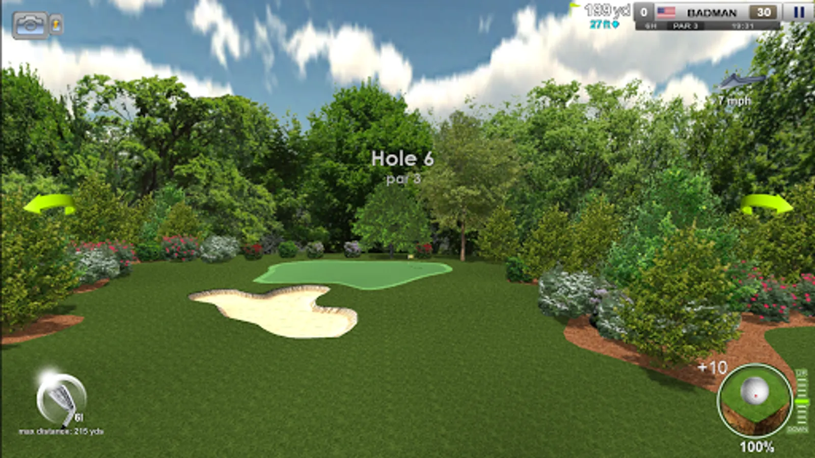 Take stock of the hole with intuitive camera controls. Choose your club and take aim for your next masterful stroke. Aiming is done with two panning buttons for your thumbs on either side of your device's screen. Power of the shot comes from a simple meter that is held down longer for higher power shots.