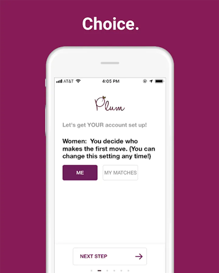 *Women are given the choice to customize their user experience by being given the choice to decide who makes the first move - "Me" or "My Match." Plum takes the guess-work out of who should send the first message. Women can change this setting at any time.